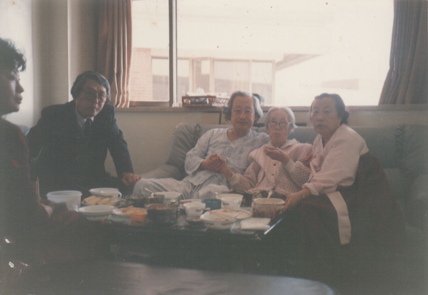 ◇입원 검사 중인 서울대병원 병실에서 문익환 목사와 가족들(왼쪽부터 며느리 정은숙, 동생 문동환, 문익환, 어머니 김신묵, 아내 박용길, 1990년 1월)