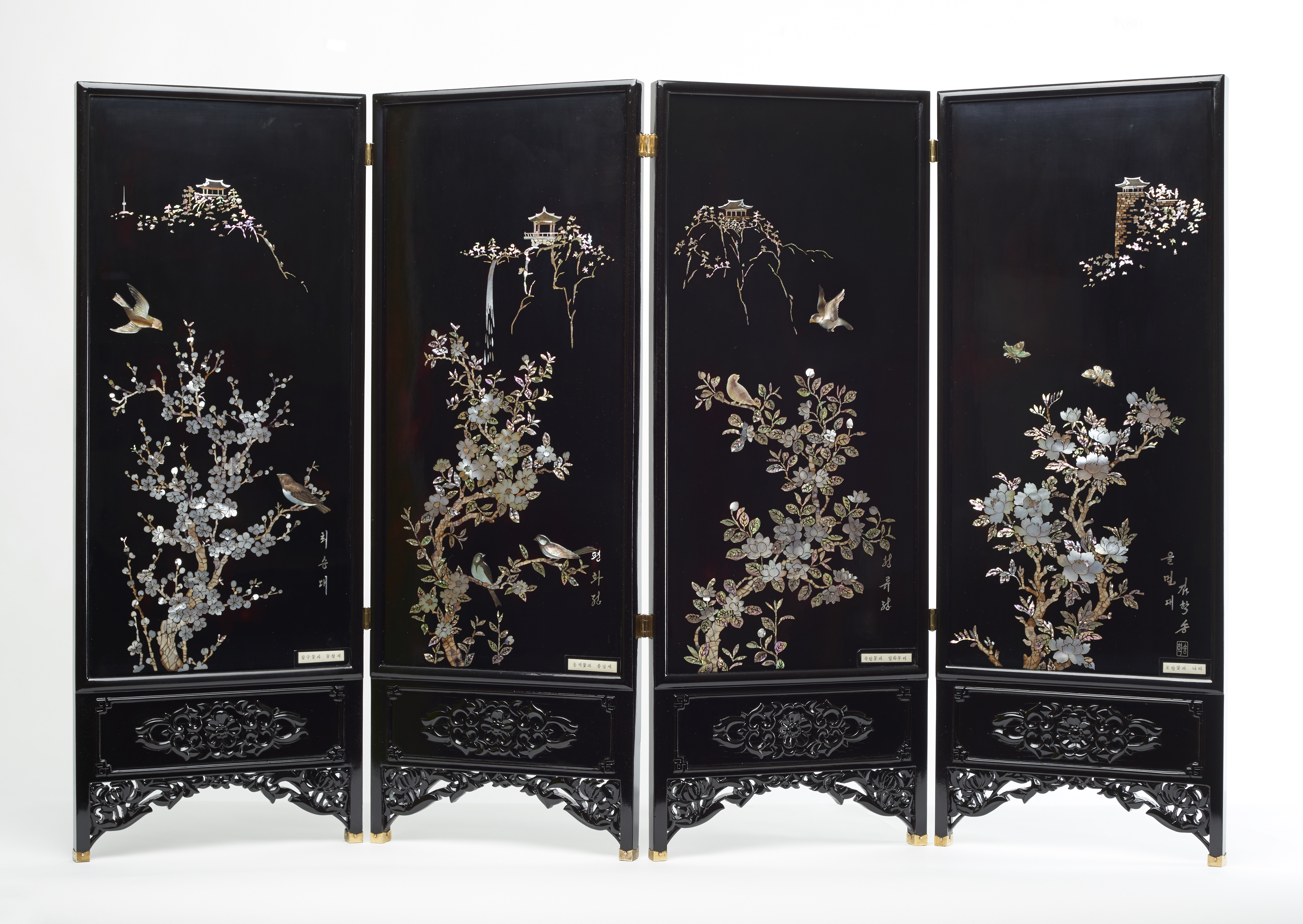 ◇문익환 목사가 김일성 주석에게 선물받은 화조문 자개병풍(김학송 작, 1980년대말, 104*68cm). 2019년 파손부를 접합하고 옻칠을 새로 하여 원래의 모습을 되찾았다.