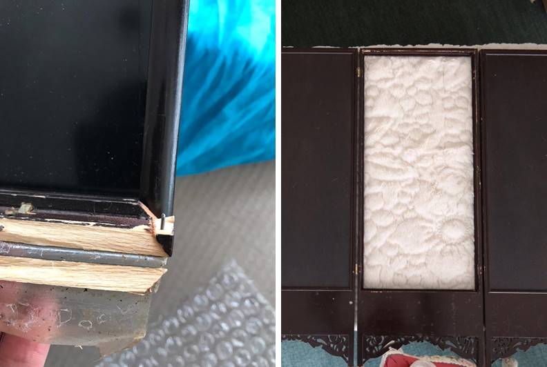 ◇파손된 병풍틀(왼쪽)과 알판이 분리된 모습(오른쪽)