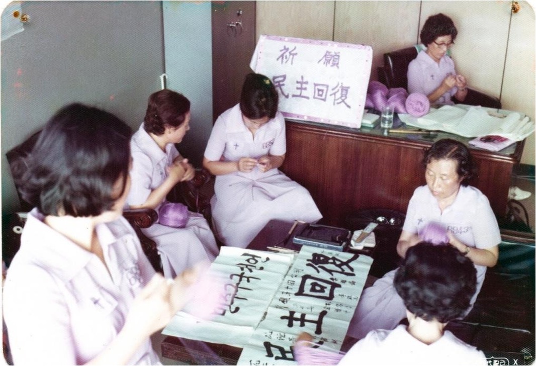 ◇1976년 ‘3·1민주구국선언 사건’ 구속자 가족들이 ‘민주회복’ 구호를 내걸고 보라색 실로 빅토리숄을 뜨개질하고 있다. ⓒ늦봄문익환기념사업회