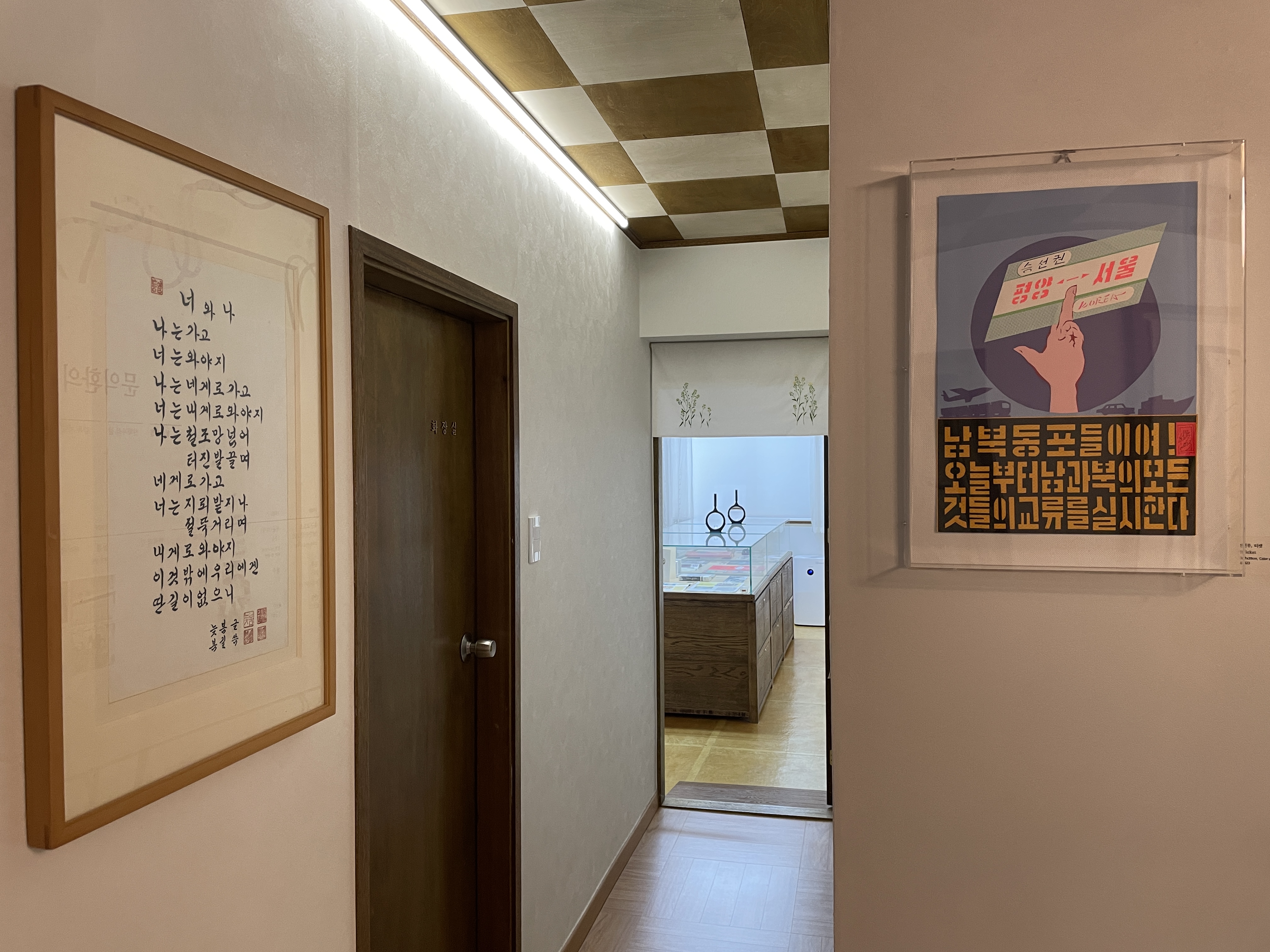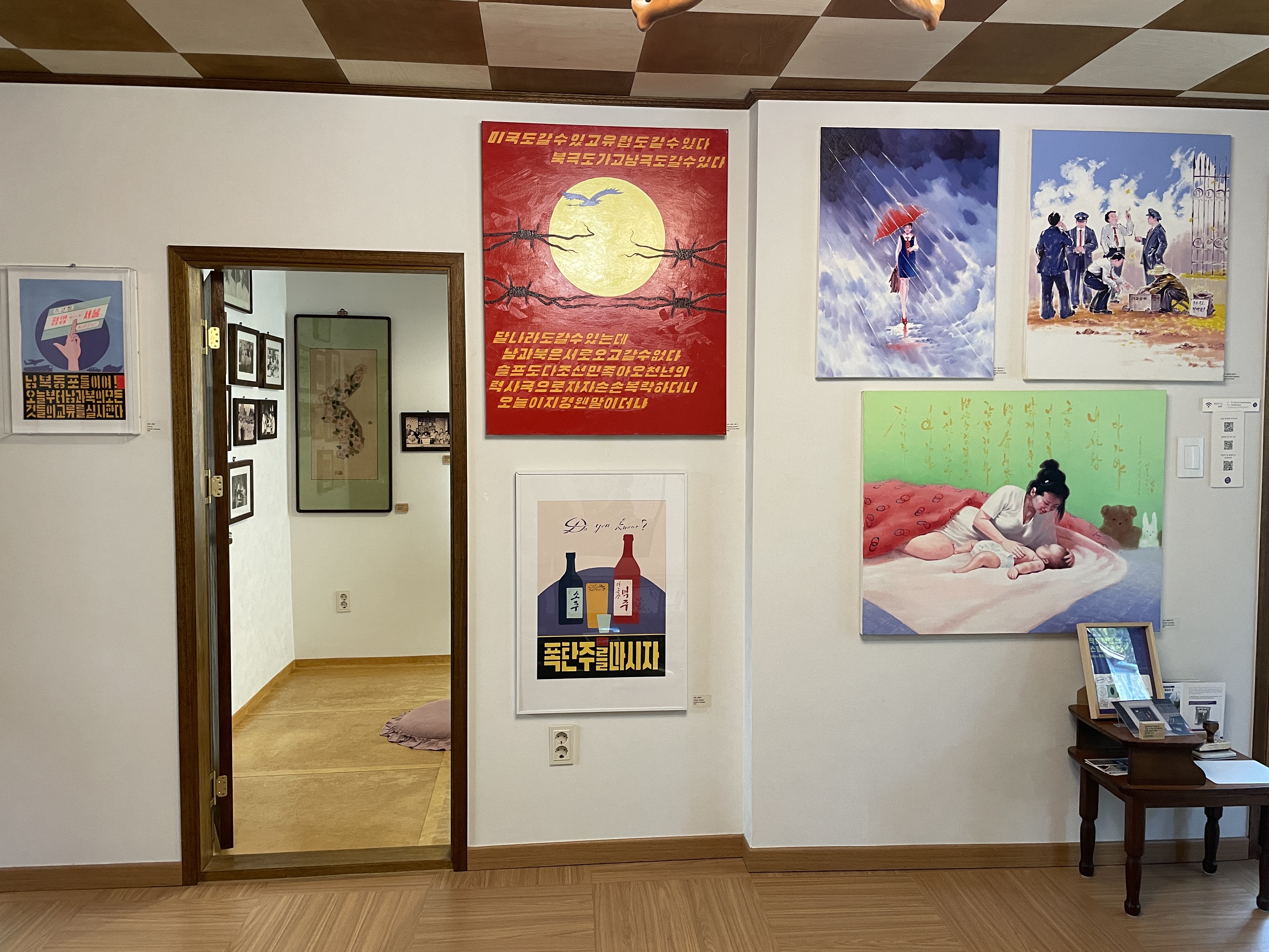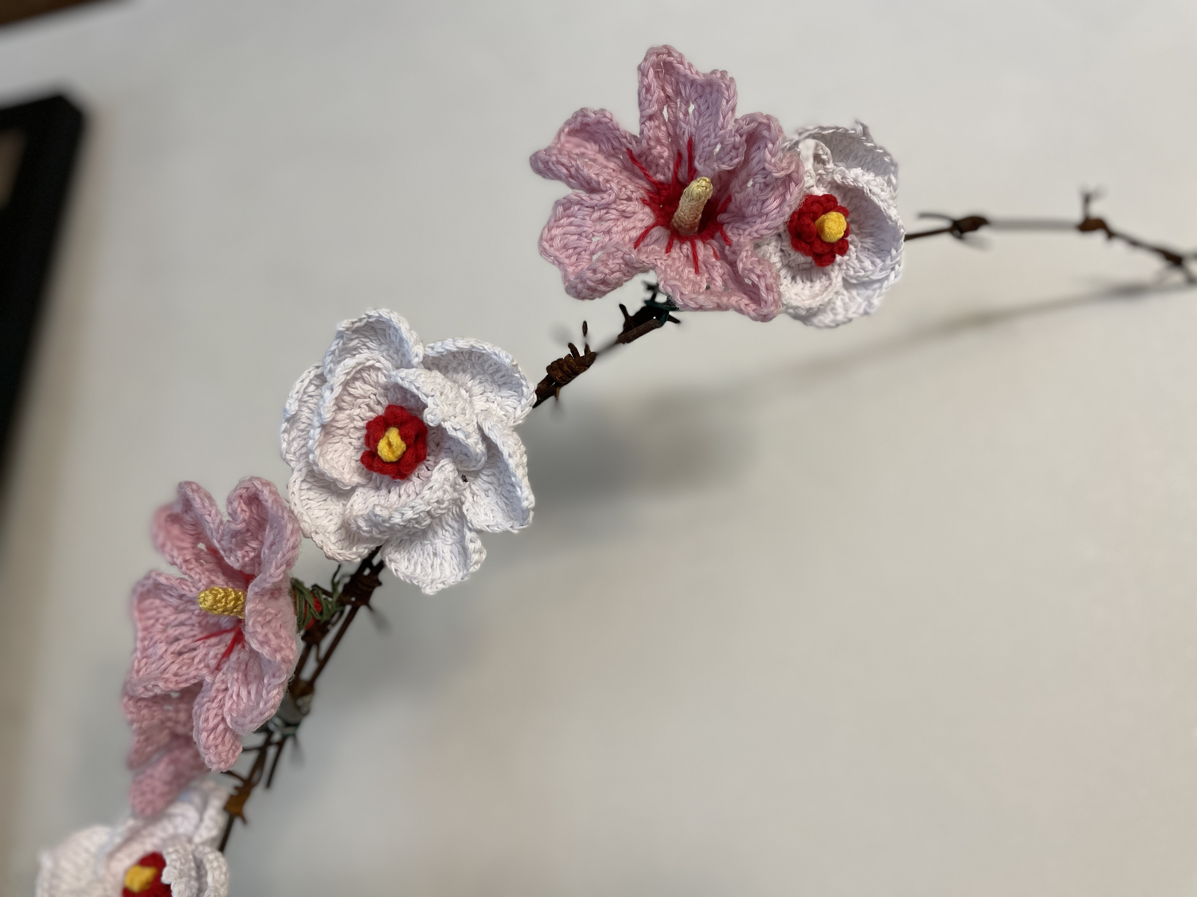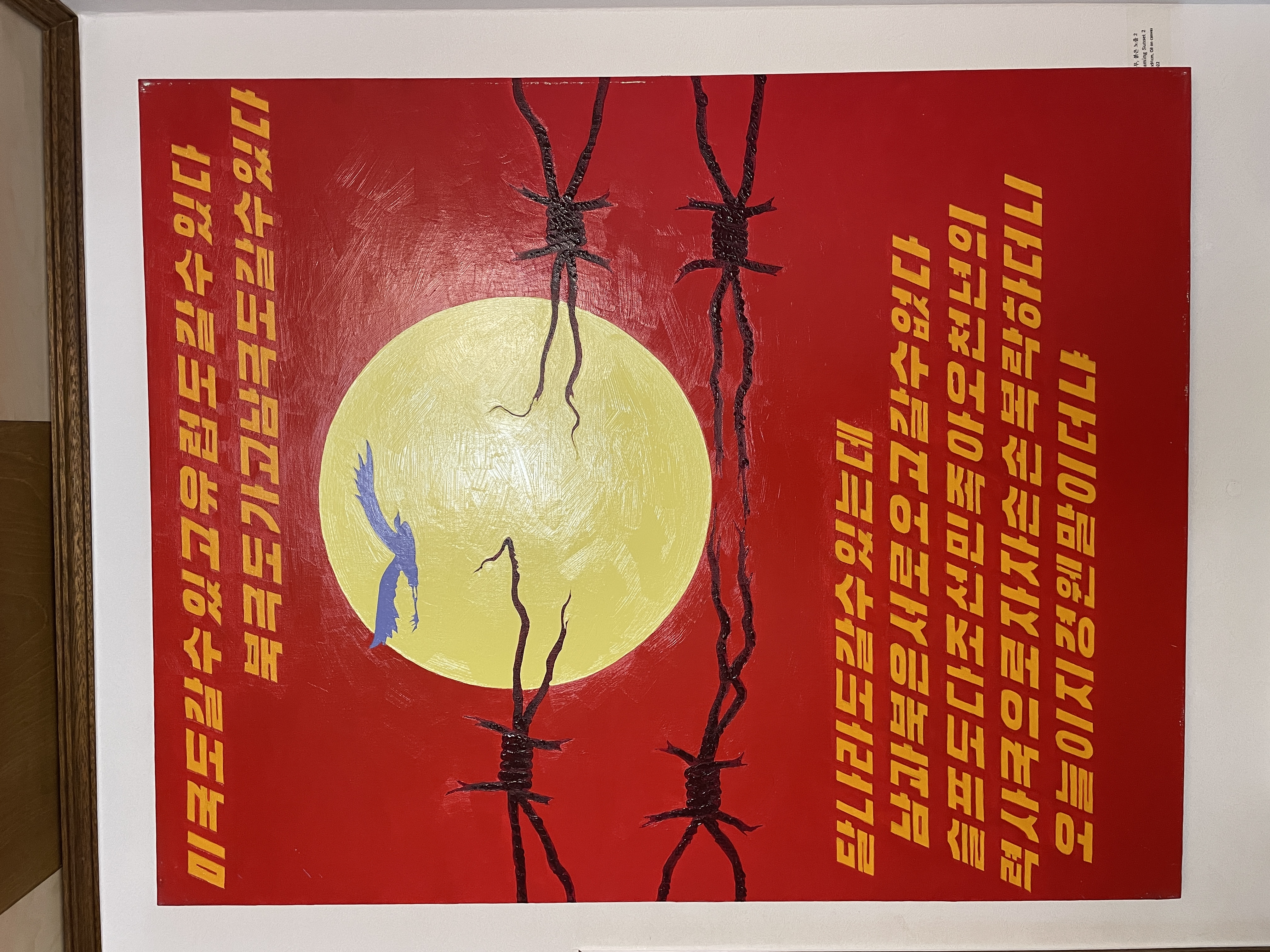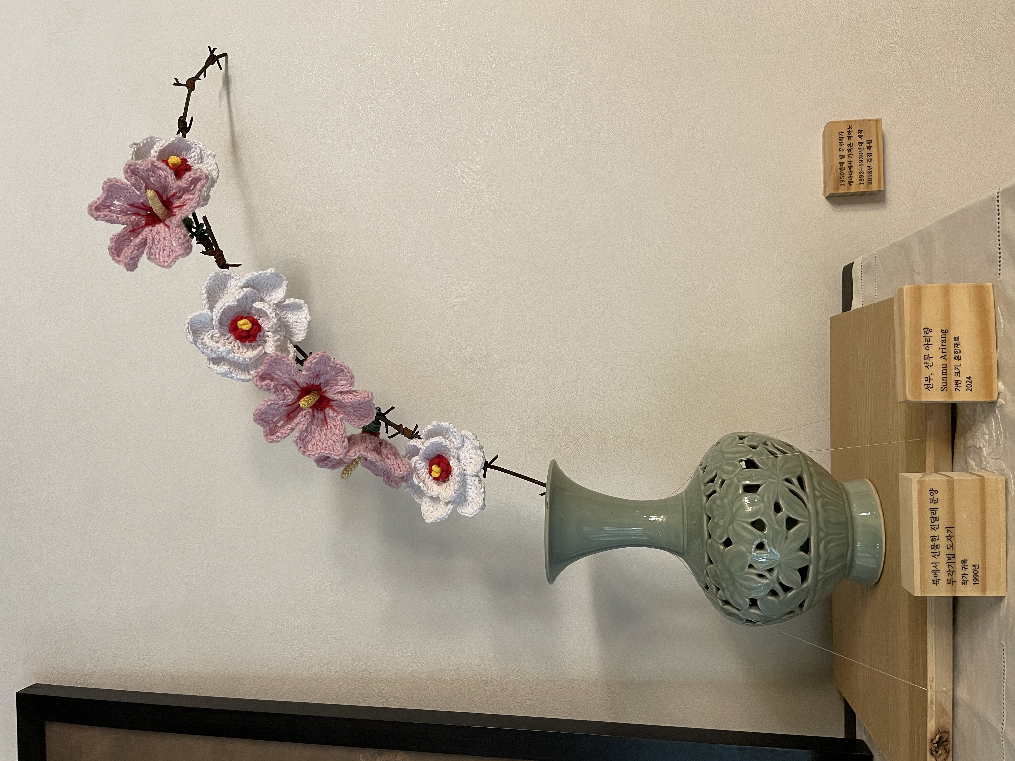 - <선무 아리랑> Sunmu Arirang, 가변 크기, 혼합재료, 2024 *소장 사료인 북에서 선물받은 도자기에 「선무 아리랑」을 설치한 모습이다. 남방한계선 철조망에 남한 여성이 뜬 무궁화와 북한 여성이 뜬 목란을 장식했다.