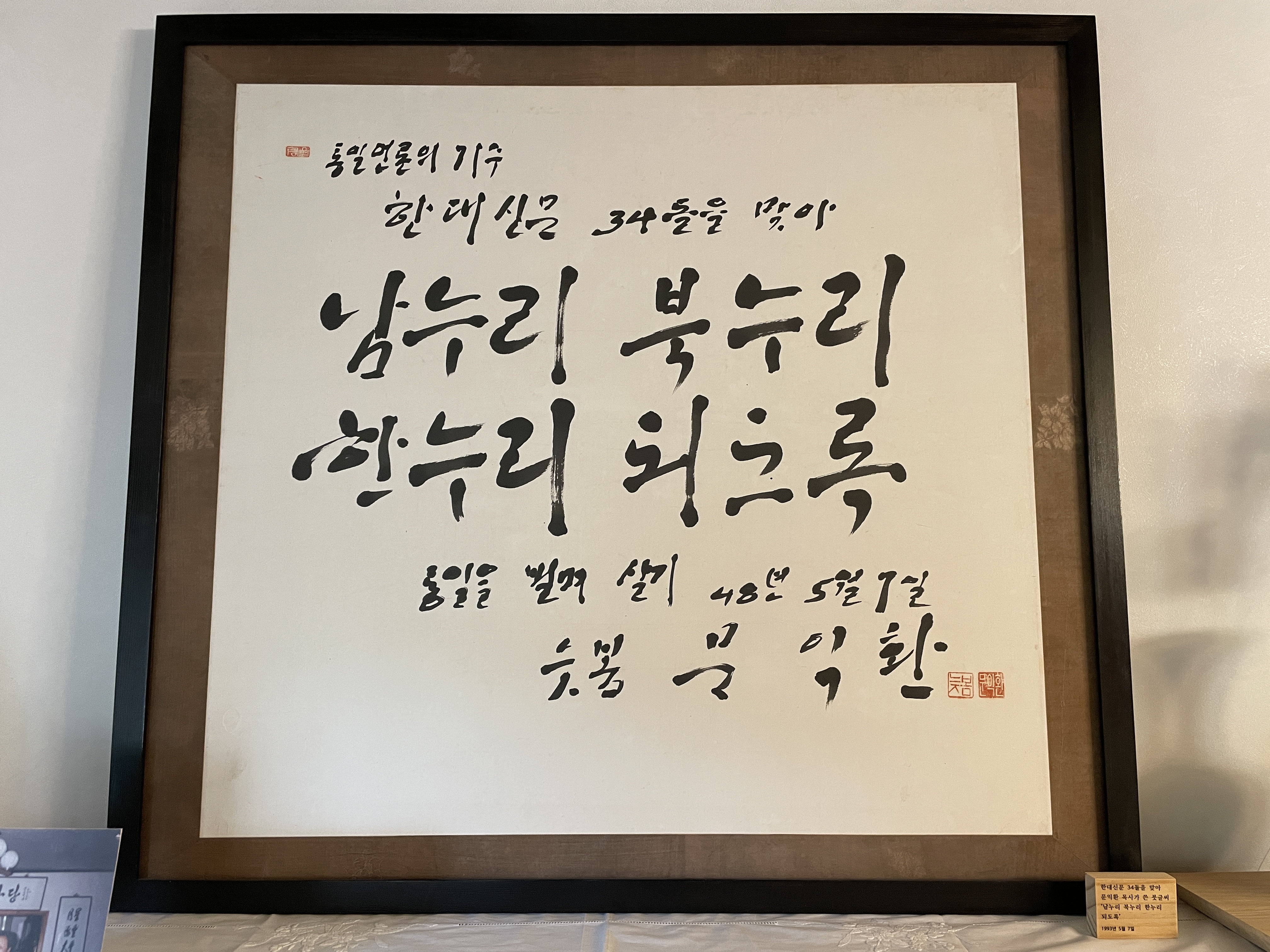 - 한대신문 34돌을 맞아 문익환 목사가 쓴 붓글씨 ‘남누리 북누리 한누리 되도록’, 1993년 5월 7일