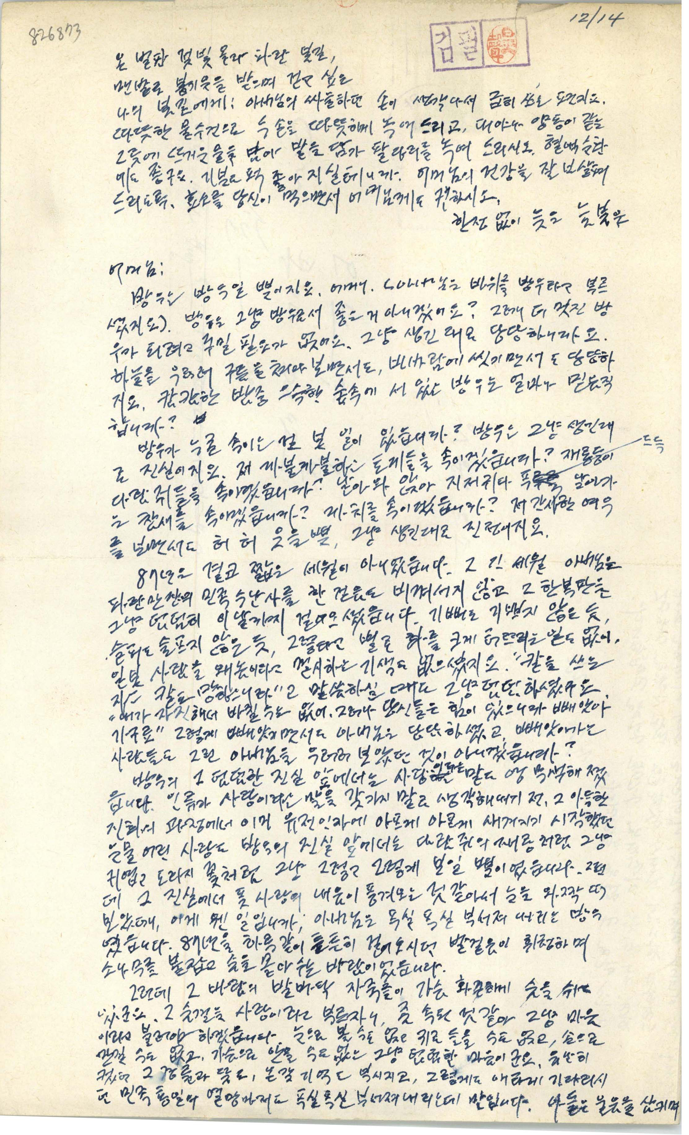 특별 외출을 허락받아 위독한 아버지를 방문한 후에 교도소에 돌아가 쓴 편지. 아버지는 위독한 상태에서 회복되어 3년을 더 사시고 85년말에 돌아가심