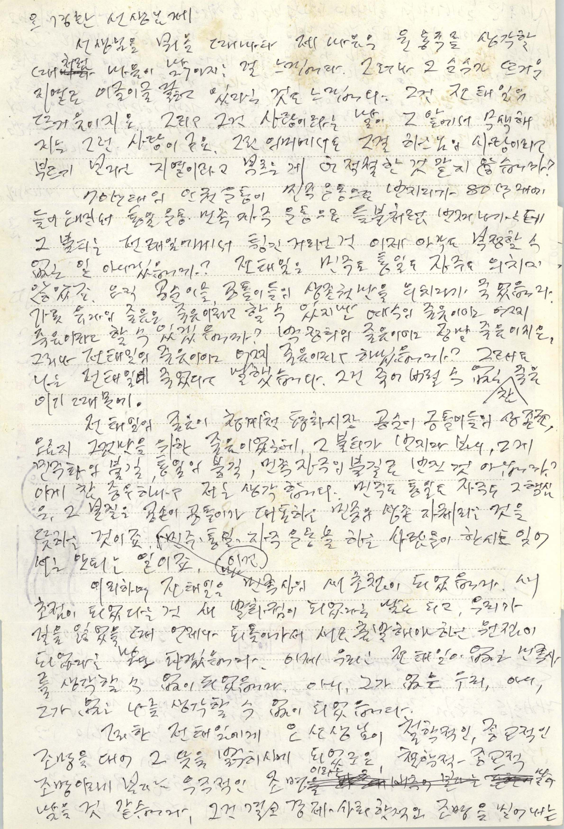 이리하여 전태일은 민족사의 새 초점이 되었습니다. 새 초점이 되었다는 건 새 발화점이 되었다는 말도 되고, 우리가 길을 잃었을 때 언제나 되돌아가서 새로 출발해야 하는 원점이 되었다는 말도 되겠습니다. 이제 우리는 전태일이 없는 민족사를 생각할 수 없게 되었습니다. 아니 그가 없는 우리, 아니 그가 없는 나를 생각할 수 없게 되었습니다.