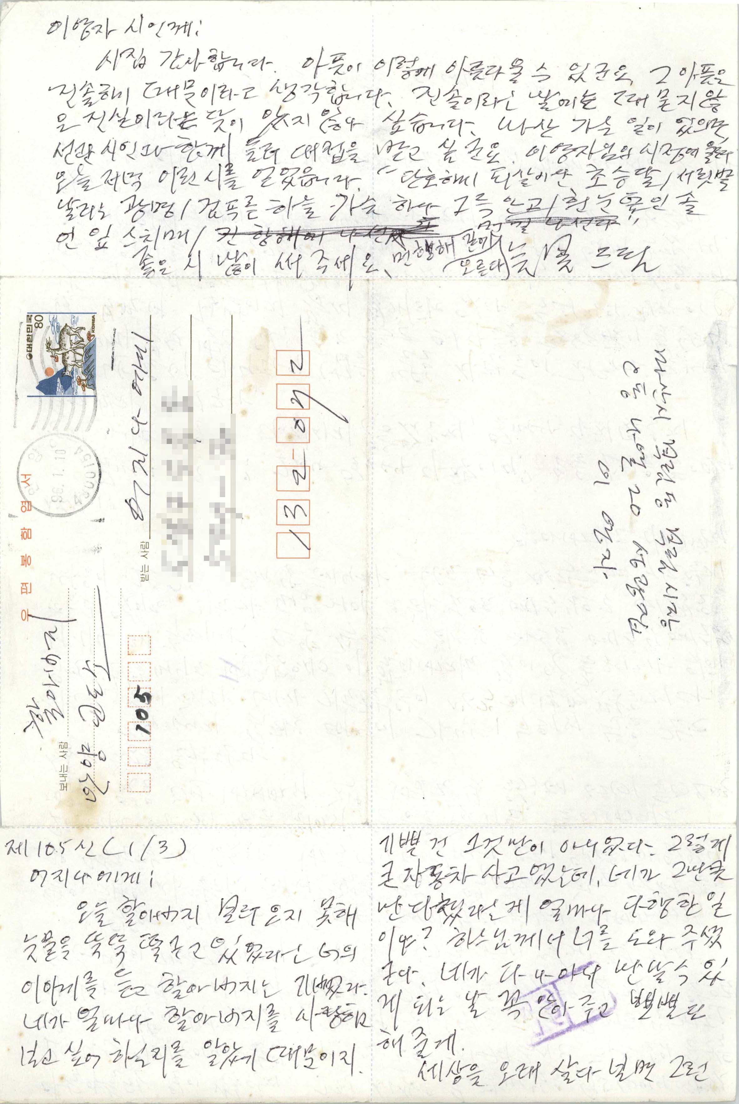 교통사고를 당한 손자 어지나와 며느리 (어지나 엄마)에게 보내는 위로와 격려의 편지. 이영자 시인에게 좋은 시를 많이 쓸 것을 당부