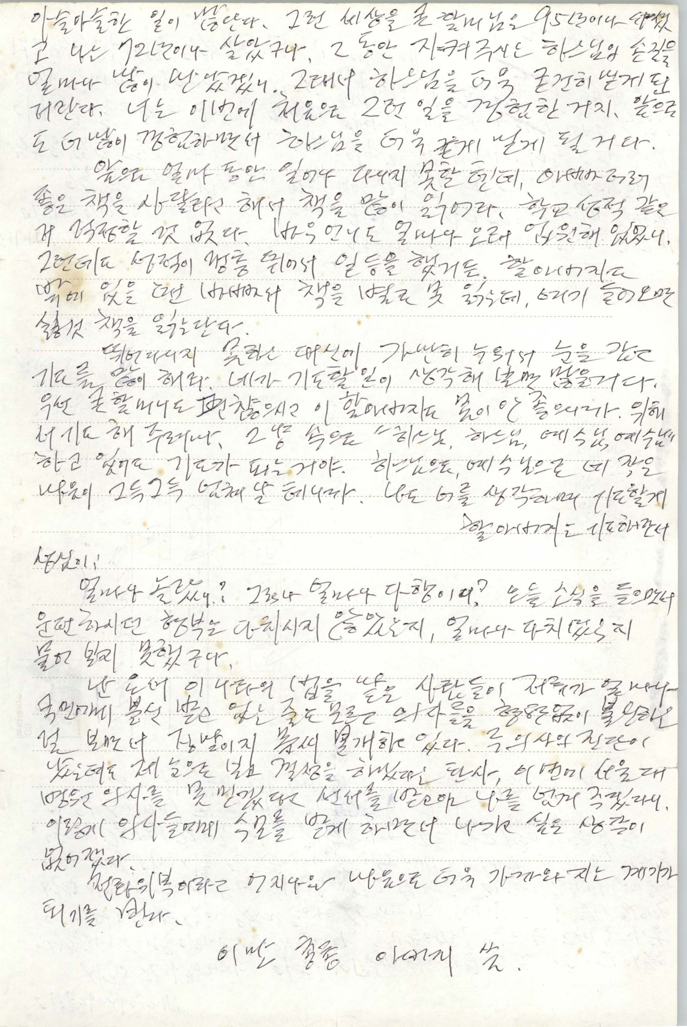 세상을 오래 살다 보면 그런 아슬아슬한 일이 많단다. 그런 세상을 큰할머님은 95년이나 사셨고, 나도 72년이나 살았구나. 그동안 지켜주시는 하느님의 손길을 얼마나 많이 만났겠니? 그래서 하느님을 더욱 굳건히 믿게 된 거란다. 너는 이번에 처음으로 그런 일을 경험한 거지. 앞으로도 더 많이 경험하면서 하느님을 더욱 굳게 믿게 될 거다.