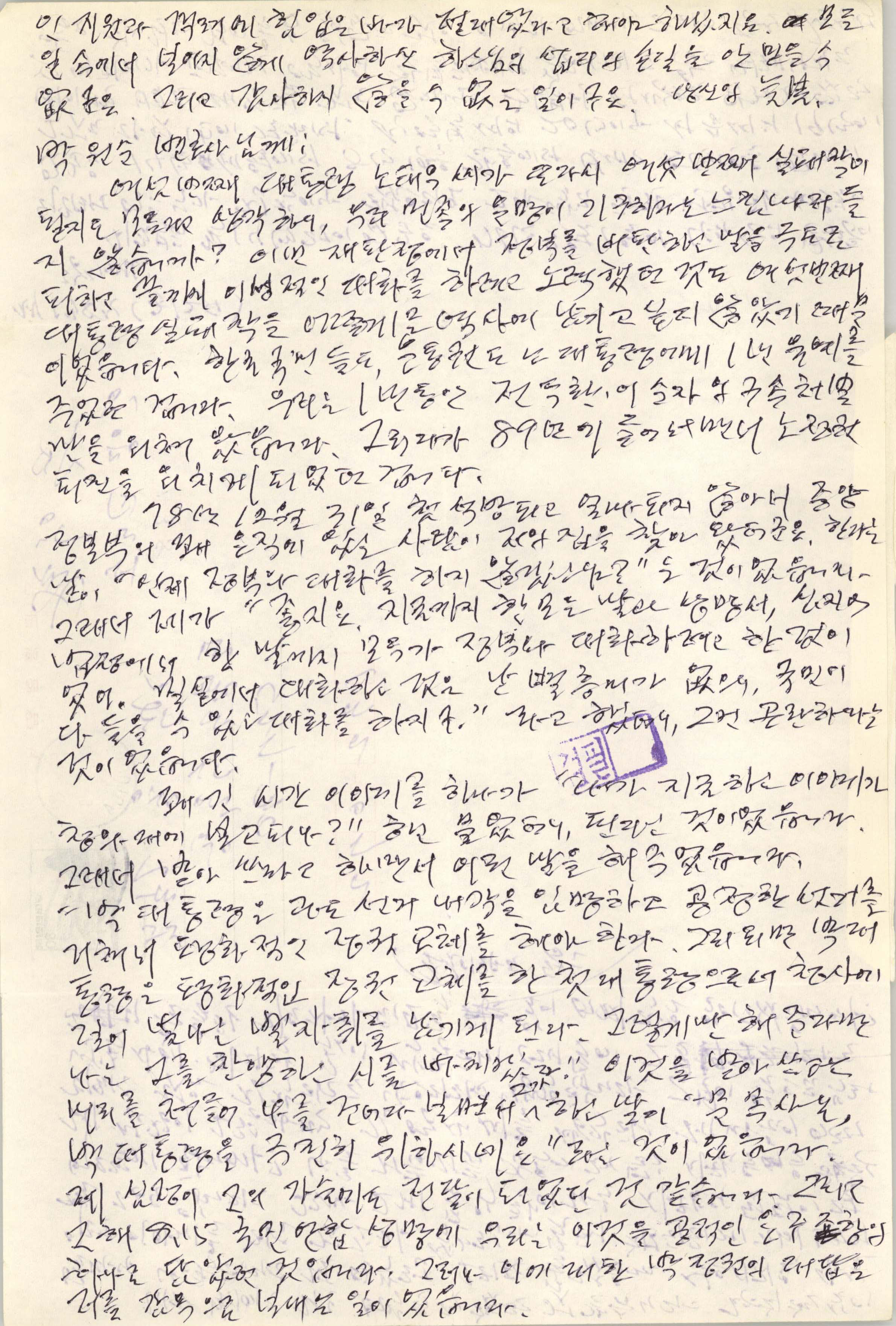 제가 보기에도 저는 너무 순진했던 것 같습니다. 정치 현실이 얼마나 냉혹하다는 걸 아무렴 그리도 몰랐을까 싶으시지요? 사실 이런 이야기를 하는 것조차 쑥스럽다 못해 창피하게까지 느껴질 정도입니다. 그러나 그게 문익환이라는 사람의 됨됨인 걸 어떻게 합니까? 나를 거듭거듭 감옥에 쳐넣는 사람들을 향한 제 심정이 그렇다면, 김영삼 씨를 생각하는 제 마음이 어떠하리라는 것은 짐작하고도 남으리라고 생각합니다. 그분이 앞으로 우리 민족사에 차지할 몫이 막중하기 때문에 그분이 훌륭한 지도자가 되도록 조금이라도 돕는 일이 어찌 작은 일이겠습니까? (다음 편지로 계속)