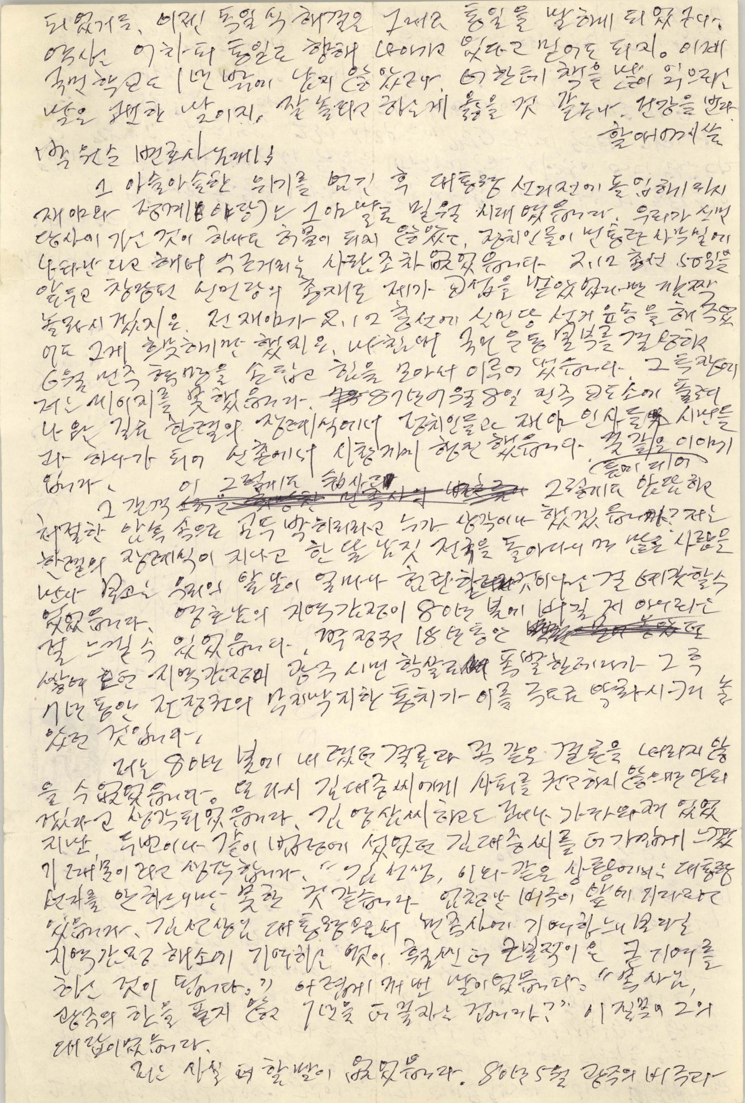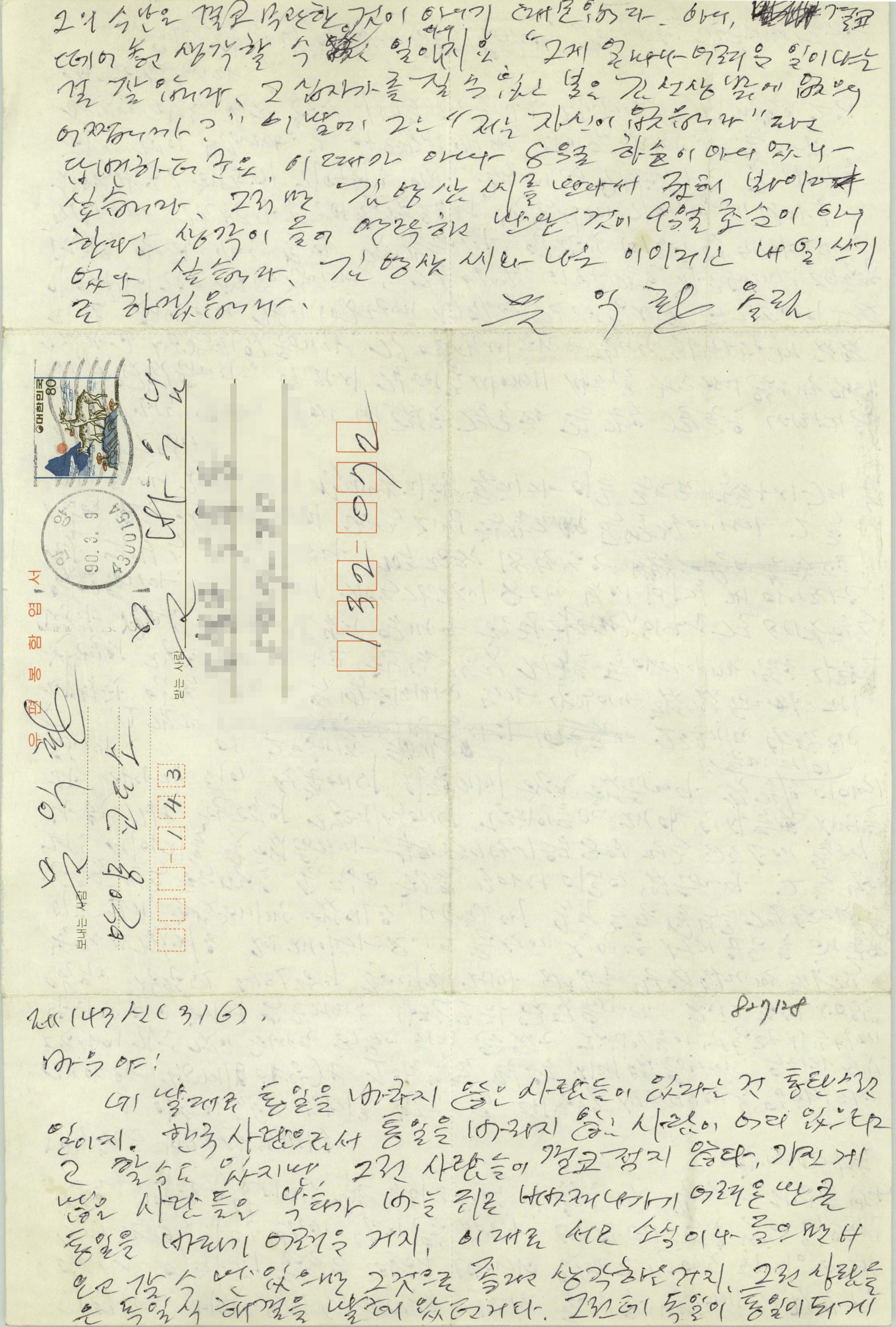 네 말대로 통일을 바라지 않는 사람들이 있다는 건 통탄스러운 일이지. 한국 사람으로서 통일을 바라지 않는 사람이 어디 있느냐고 할 수도 있지만, 그런 사람들이 결코 적지 않다. 가진 게 많은 사람들은 낙타가 바늘귀로 빠져나가기 어려운 만큼 통일을 바라기 어렵지. 이대로 서로 소식이나 들으면서 오고갈 수 있으면 그것으로 좋다고 생각하지. 그런 사람들은 독일식 해결을 말해 왔지. 그런데 독일이 통일되게 되었거든. 이젠 독일식 해결은 그대로 통일을 말하게 되었구나. 역사는 어차피 통일로 향해 나아가고 있다고 믿어도 되지. 이제 초등학교도 1학년밖에 남지 않았구나. 너한테 책을 많이 읽으라는 말은 괜한 말이지, 잘 놀라고 하는 게 옳을 것 같구나. 건강을 빈다.
