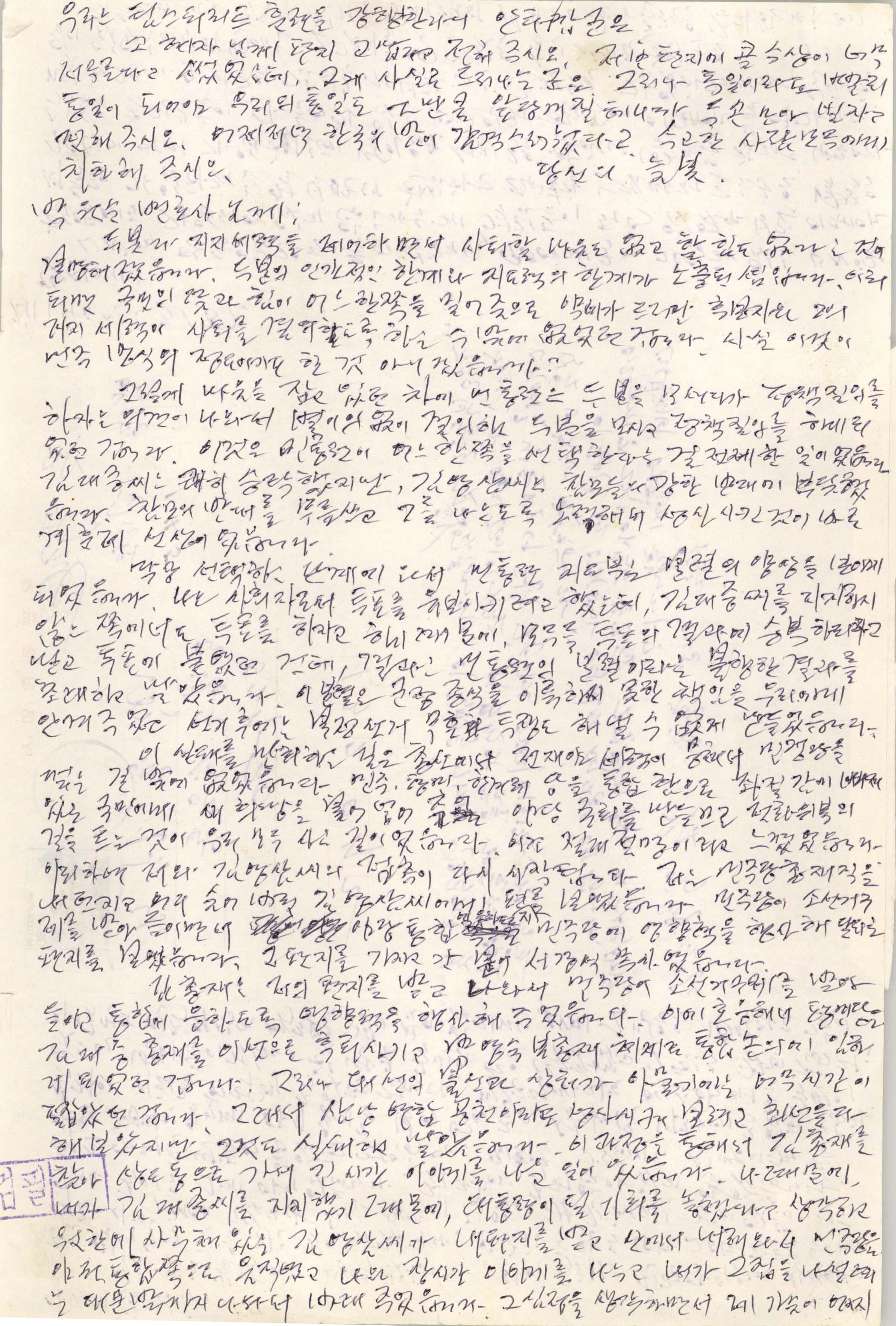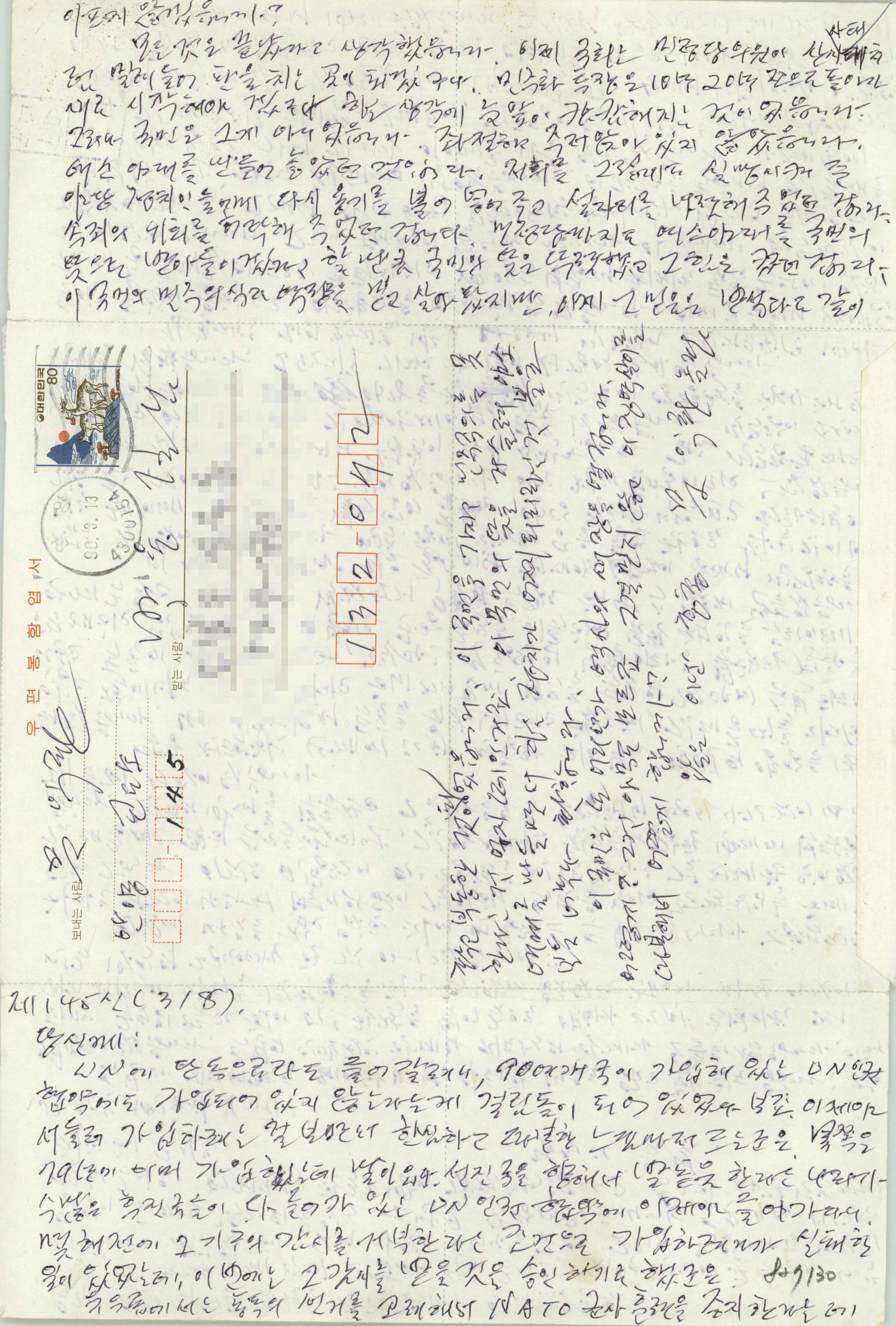 소혜자 님께 편지 고맙다고 전해 주시오. 저번 편지에 콜 수상이 너무 서두른다고 썼는데, 그게 사실로 드러나는군요. 그러나 독일이라도 빨리 통일이 되어야 우리의 통일도 그만큼 앞당겨질 테니까 두 손 모아 빌자고 전해 주시오. 어제저녁 한국의 밤이 감격스러웠다고. 수고한 사람 모두에게 치하해 주시오.