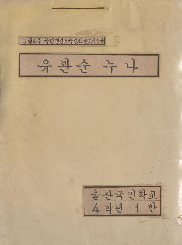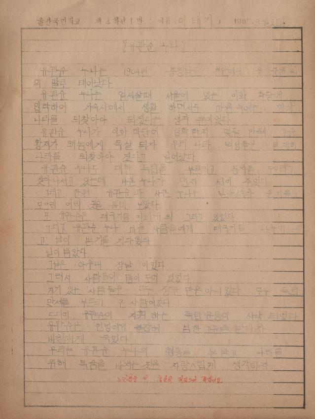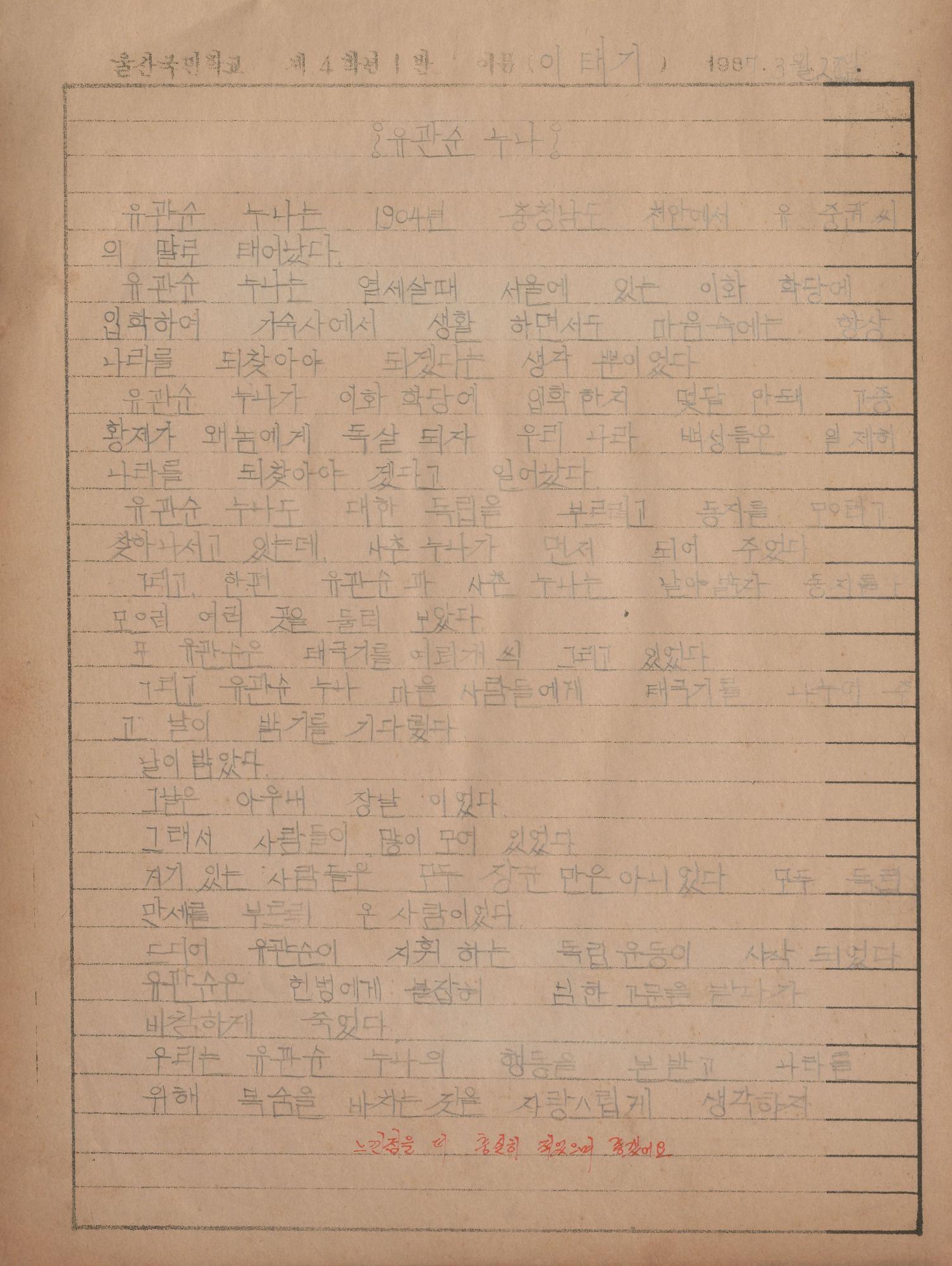 울산국민학교 1987년 3월4주 4학년 1반 국민정신교육심화글짓기모음 유관순 누나