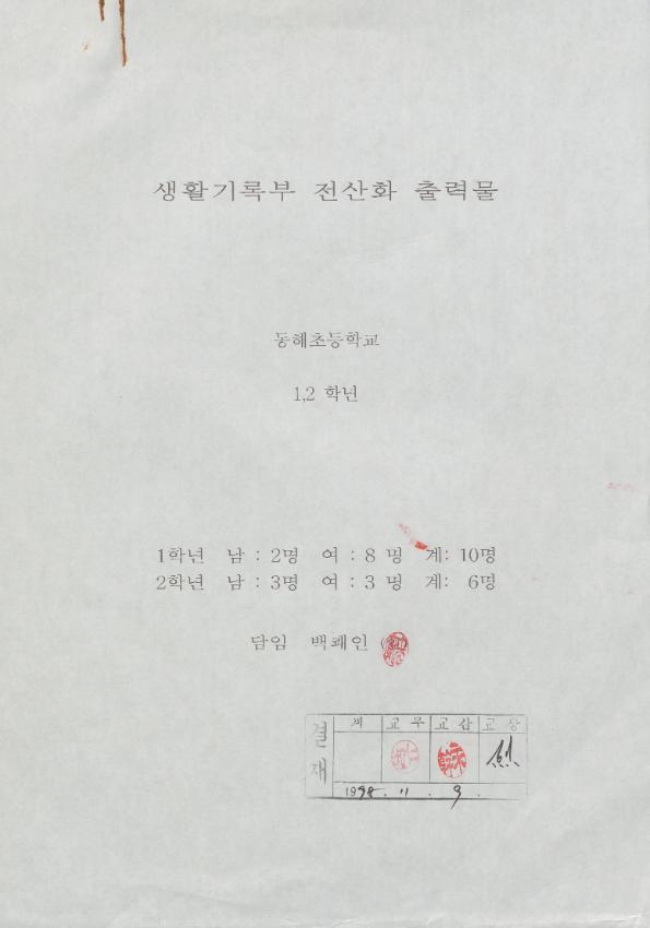 동해초등학교 1998년 생활기록부 전산화 출력물 동해초등학교 1,2학년