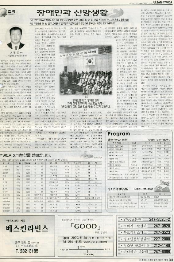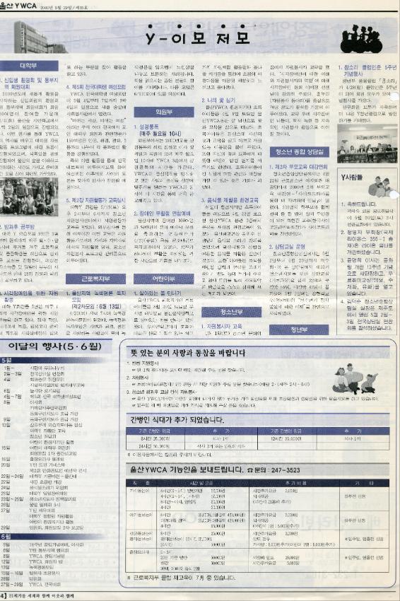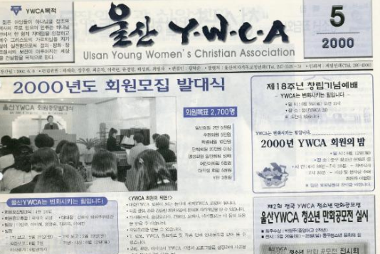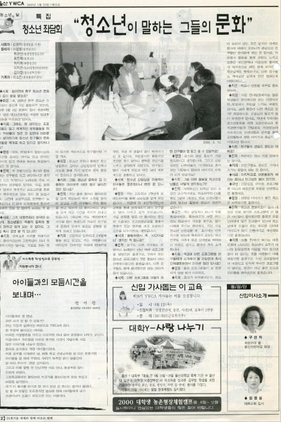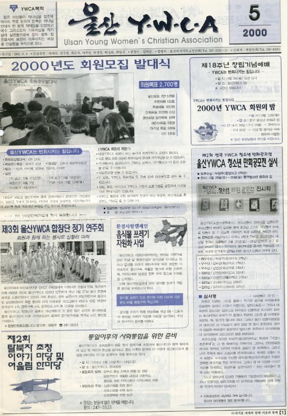 2000년 5월 제35호 울산YWCA 소식지이다. 2000년도 회원모집 발대식, 청소년 좌담회, 오정일 목사의 컬럼이 담겨있다.