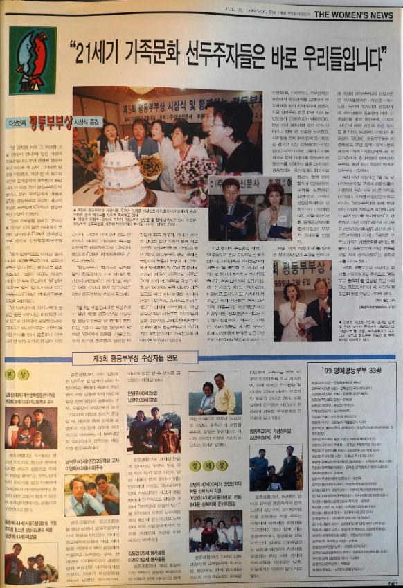 1999년 7월 16일 발행된 여성신문 제534호의 15면. 1999년 7월 6일 진행된 제5회 평등부부상 시상식 스케치 기사가 실렸다.