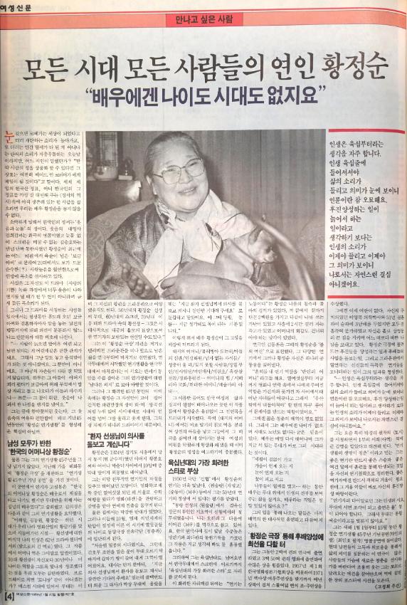 여성신문 제7호(1989년 1월 20일 발행) 4면 "만나고 싶은 사람" 기획면. 배우 황정순의 인터뷰 기사가 실렸다.