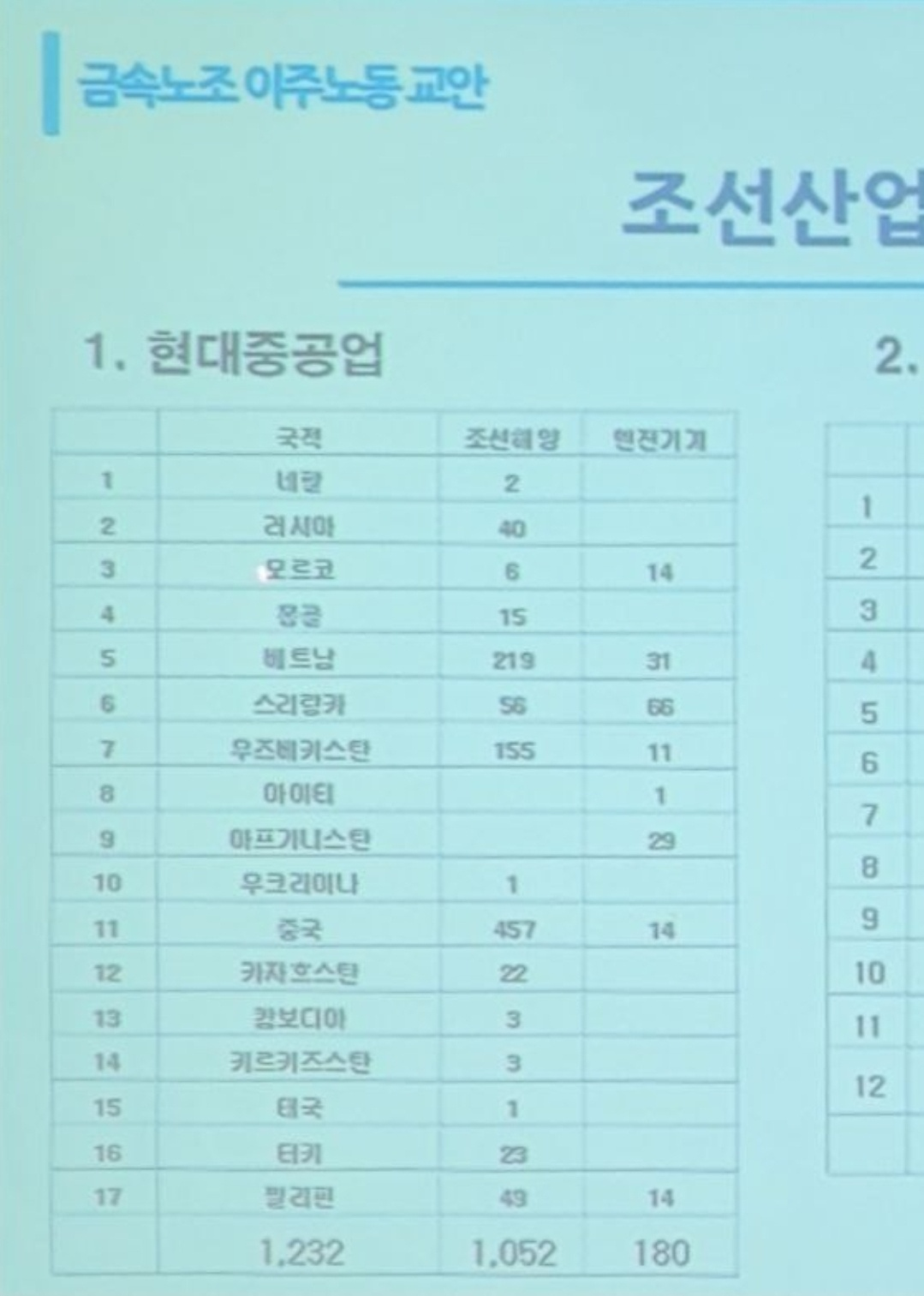 혹독한 구조조정으로 인력을 줄고 긴축정책으로 실질임금도 삭감되었다. 노동자들을 힘들게 한 조선업 불황기는 2018년부터 조금씩 나아지기 시작했다. LNG선 발주가 점차 늘고 이후 컨테이너선 발주도 늘어났다. 텅빈 물량은 서서히 채워지더니 지금은 수년 치 물량이 확보되었다, 선가는 점점 올라 조선업 최대 호황기인 2008년 수준의 선가를 회복했다. 불과 몇 년 전까지 인력을 내보내던 조선업은 순식간에 인력이 부족해졌다. 구조조정으로 피눈물 흘리게 만들어 쫓아내더니 물량 많다고 이제 돌아오라고 손짓하는 상황이 참으로 아이러니하다. 현장을 떠난 노동자들은 새로운 직장을 구했다. 이미 구조조정 시기에 임금도 삭감되었고 창사이래 470여 명이 산업재해로 사망한 사업장에 돌아가기는 쉽지 않았다. 대규모 정규직 모집을 한다면 많은 인원을 채용할 수 있겠지만 사용자 측은 그럴 마음이 없어 보였다. 노동자들의 거센 항의를 짓누르고 삭감시킨 임금회복도 가능성도 희박했다. 회사는 차선으로 이주노동자를 대규모로 유입시키는 것이다.