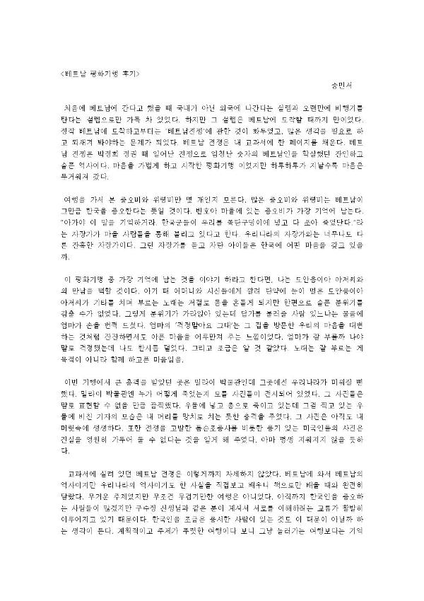 아! 이를 어쩌나 시간이 지날수록 나의 무지와 준비하지 못한 나의 행동에 부끄러움과 미안함의 그림자가 점차 짙게 베여갔다. 아주 오랜 시간 전에 우리의 부모님들이 베트콩하며 이야기하던 월남전의 현실에 나는 할 말을 잊었다. 전쟁에서 살아남은 자들의 역사적 증거가 나를 옭아 메는 것 같았다. 아프고도 너무나 아픈 전쟁의 역사를 증거와 증언으로 다시 살아 움직이고 생명을 얻기 위해, 평화를 기리기 위해 온 몸으로 부딪히고 있는 그와 그들을 보며 나는 참으로 감사한 마음이 일었다. 한 없이 고마웠다.