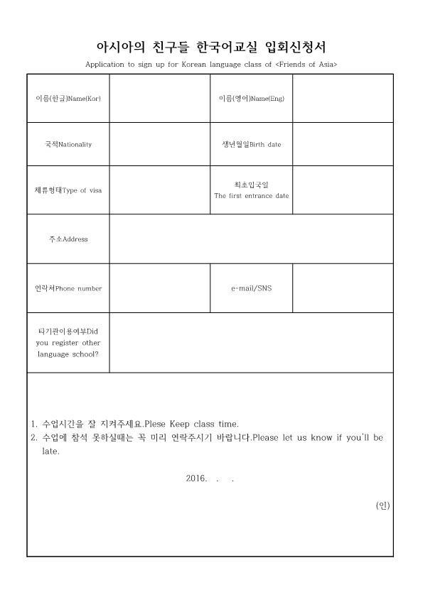 한국어교실 입회신청서 양식