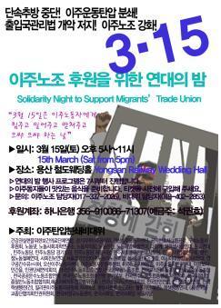 한국에도 이주노동자들의 노동조합이 결성되었다. 아직 합법화는 되지 않았던 시기이다. 그래서 활동 재정을 마련하고자 해마다 후원의 밤을 준비했고, 단체들은 십시일반 후원금을 보냈다. 후원의 밤을 알리는 행사 포스터에는 장소, 티켓값, 행사 내용 등이 기록되어 있다. 강제단속과 추방이 심하던 시절이라 후원행사에도 이주노동자 탄압 분쇄를 알리는 구호가 실려 있다. 행사 주최도 이주탄압분쇄비대위로 ...