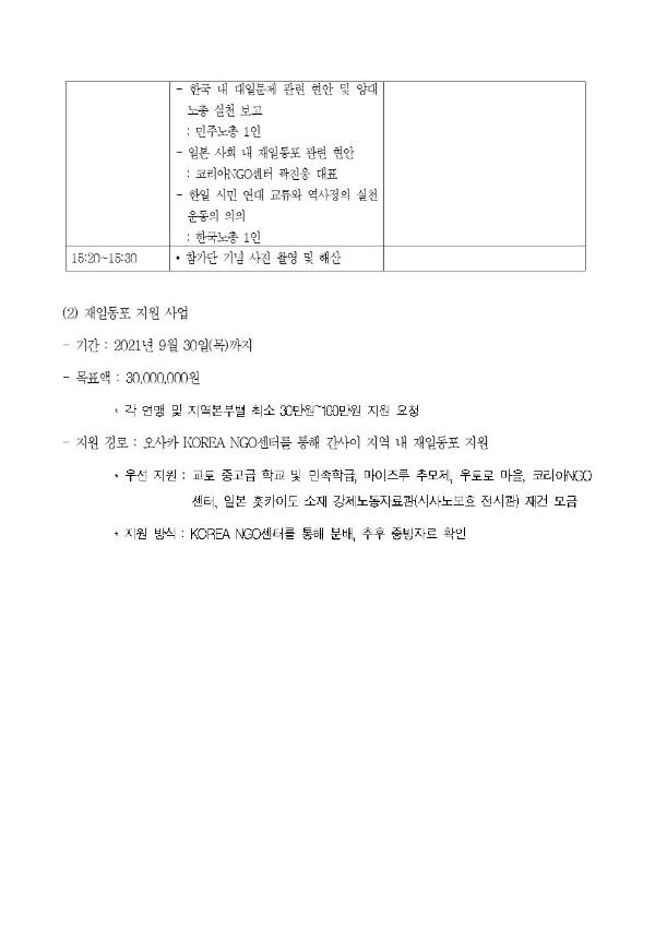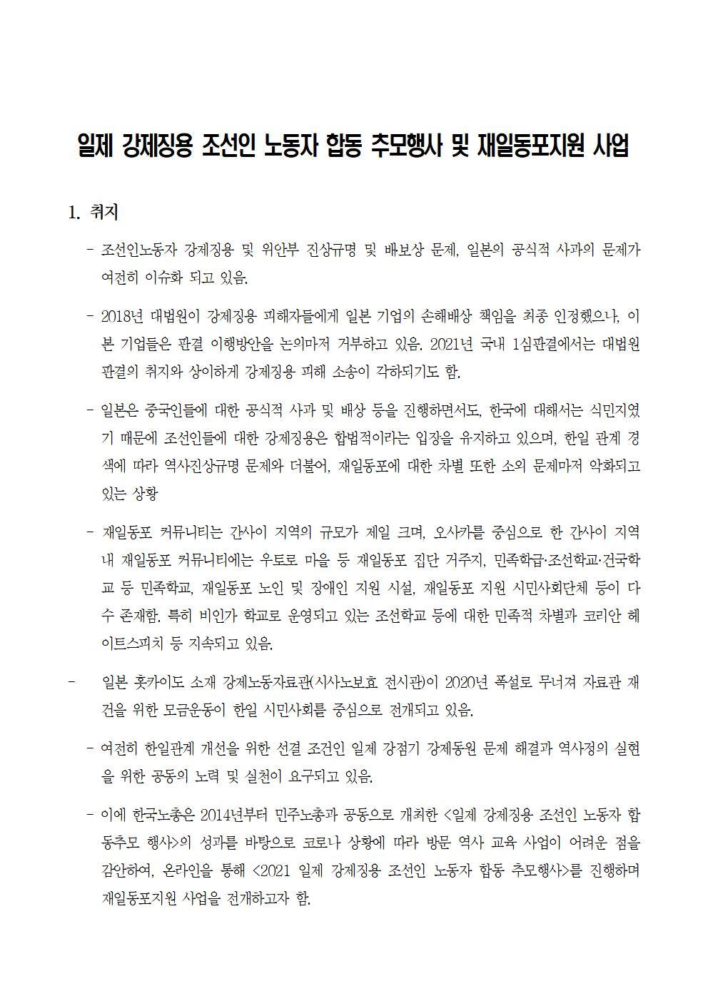 한국노총은 민주노총과 함께 “일제 강제징용 조선인노동자 합동추모사업”을 진행하며, 간사이 지역 (오사카 및 교토 등) 내 재일동포사회와의 연대를 꾸준히 추진해왔음. 관련하여 2021년 , 한국과 일본 관계단체들이 이후 지원사업의 내용이 담긴 보도자료를 발표함 * 교토 소재 마이즈루 (우시키마 추모제), 교토 소재 중고급 학교, 교토 츠루하시 소재 민족학급, 교토 소재 우토로마을, 오사카 소재 KOREA NGO센터 등
