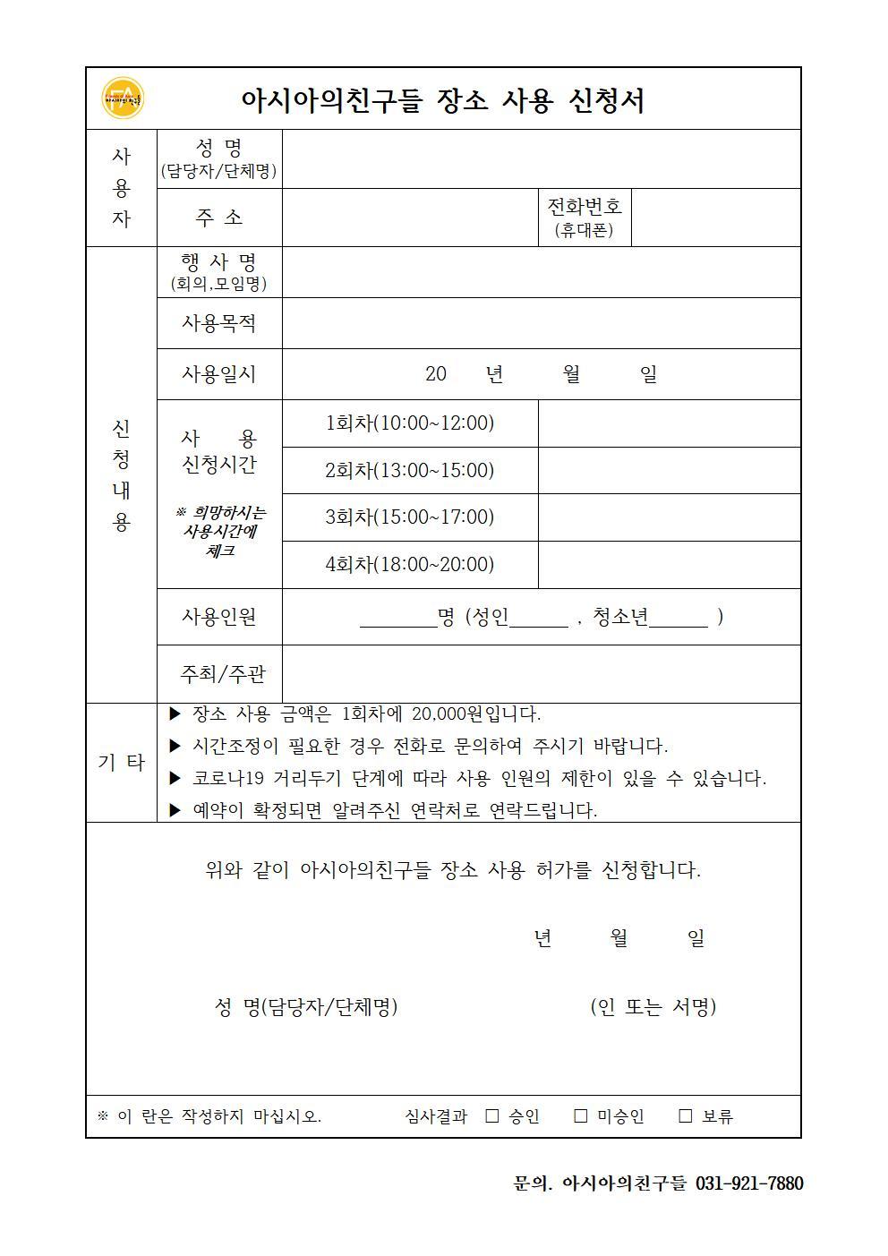 코로나시기, 단체공간 유지도 어렵고 재정도 어려웠다. 반면 집단활동이 어려운 사람들이 소규모로 모임을 할 수 있는 공간을 찾고 있어서 공간대여를 하기 시작했다, '공간이용자들에게 사용규칙, 비용을 알리는 정보지를 제작했다. 이를 뒷받침하는 문서기록이다.
