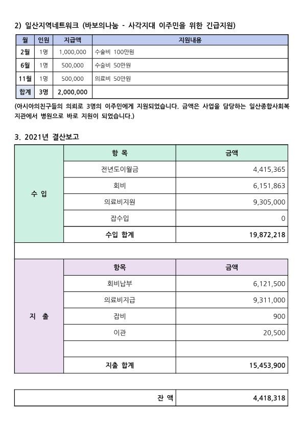 2021년 이주민 의료지원 결과