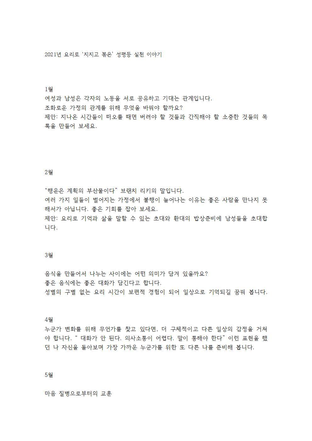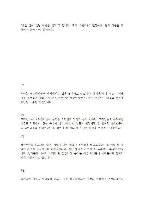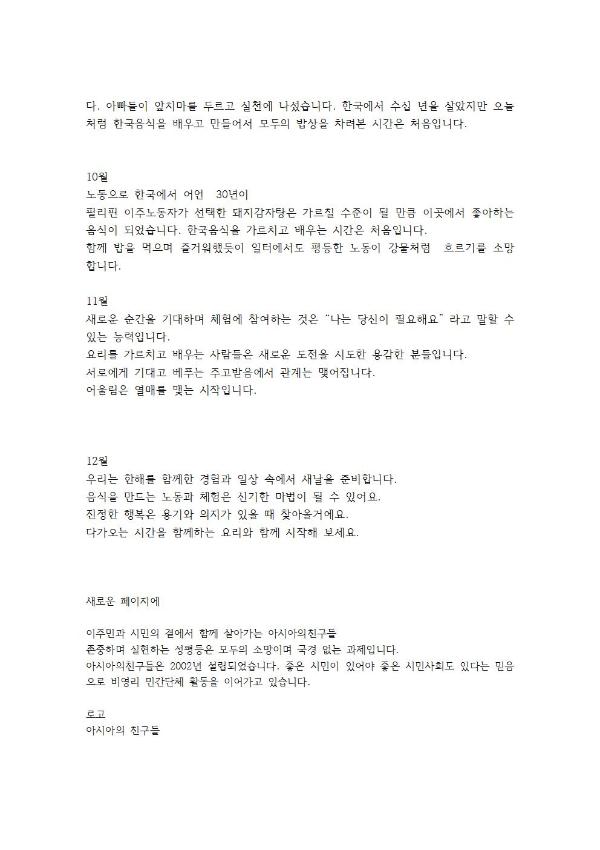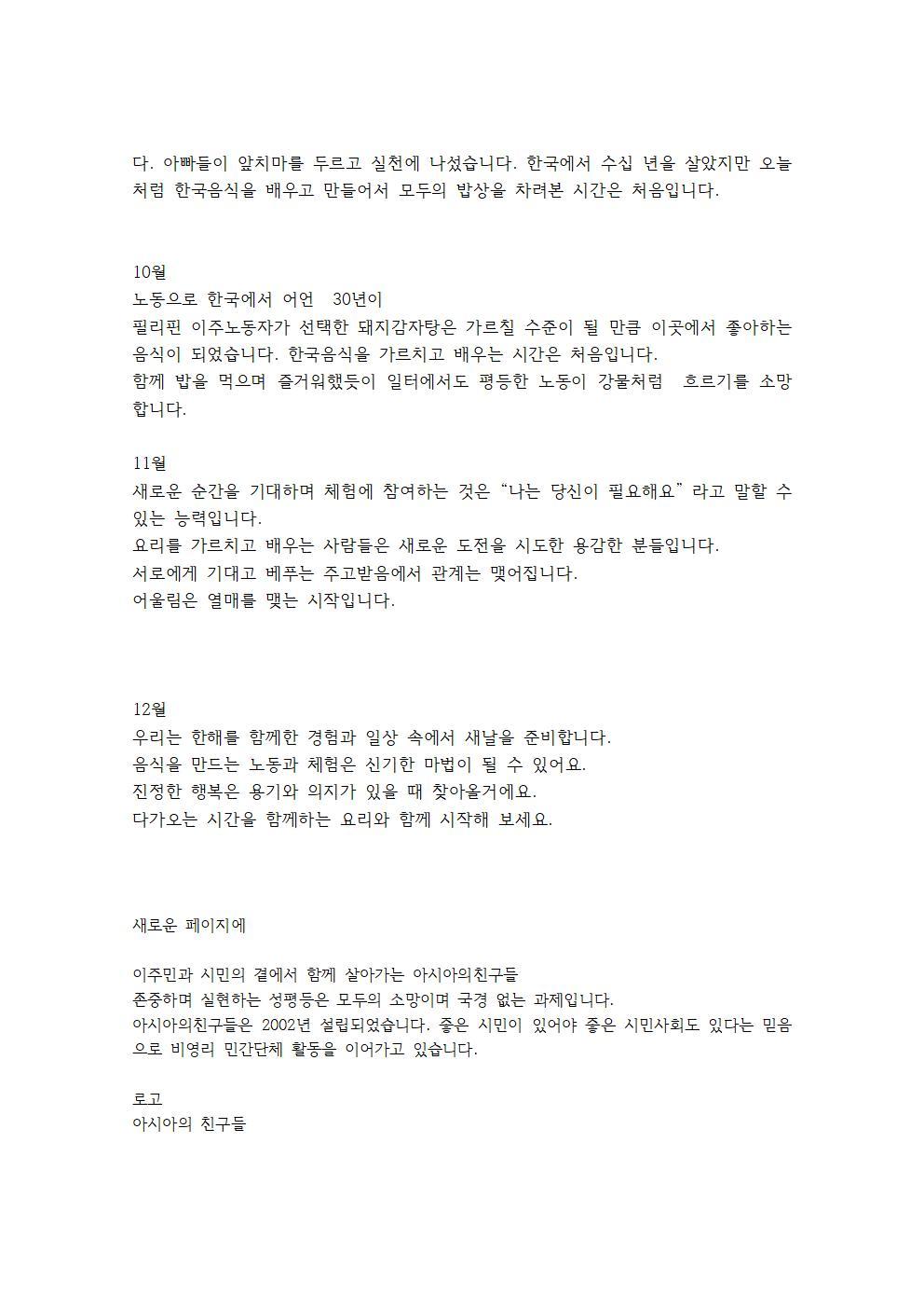 2021년 이주민 가정, 남성들과 1년 동안 요리교실을 진행한 후 이를 기념하는 사진기록을이용하여 제작된 달력 박물이다. 달력은 회원들에게 배포됨.