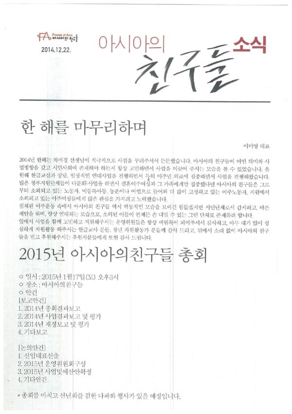 아시아의친구들 소식지 2014년 하반기(날짜: 2014.12.22)
