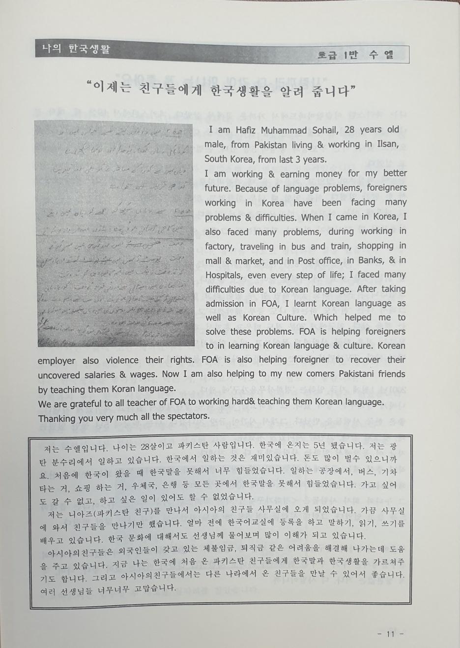 파키스탄에서 온 수엘의 한국생활 초기 힘들었던 일과 아시아의 친구들에서 받은 도움에 관한 내용이다