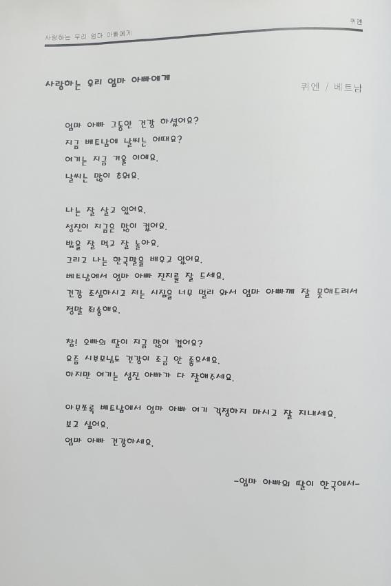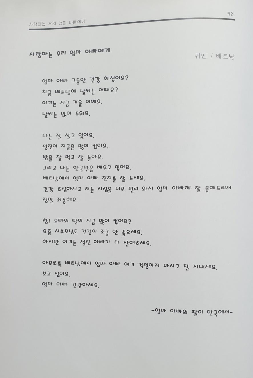 베트남에서 온 퀴엔이 부모님께 보내는 편지글이다. 한국어를 배우고 처음 쓴 편지이다.