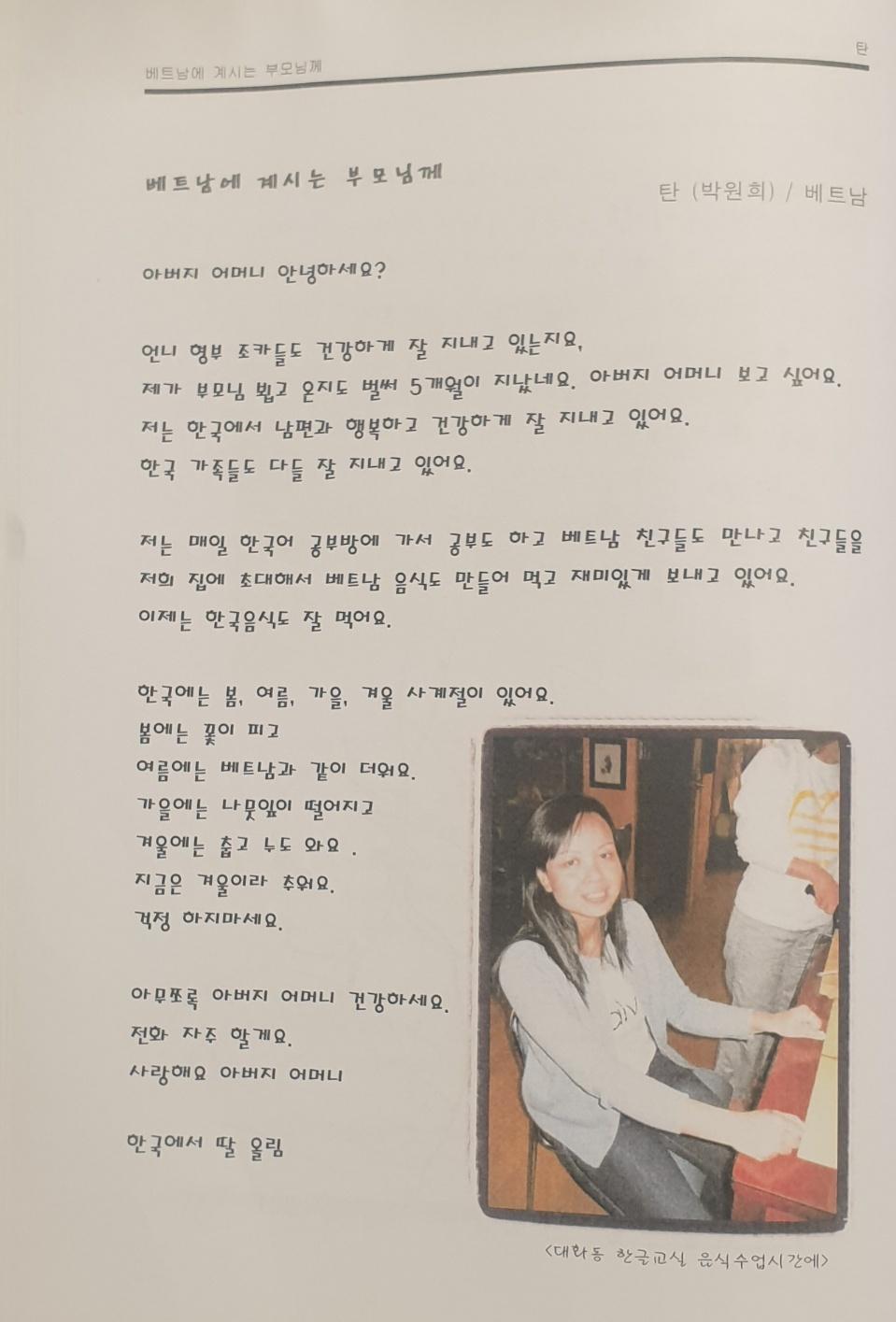 베트남에서 결혼이주해온 탄 씨가 부모님께 올리는 편지글이다.