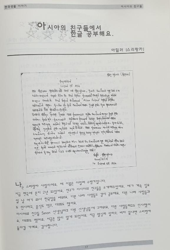아시아의 친구들에서 한글을 배우고 다른 사람들과 교류하며 느끼는 감사함에 대한 글이다