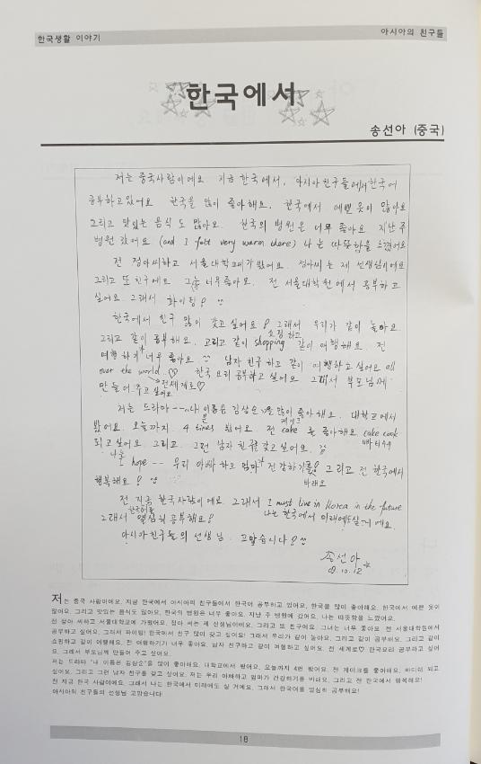 중국에서 온 여학생이 느끼는 한국의 다양하고 예쁜 곳들과 애정에 대한 이야기이다