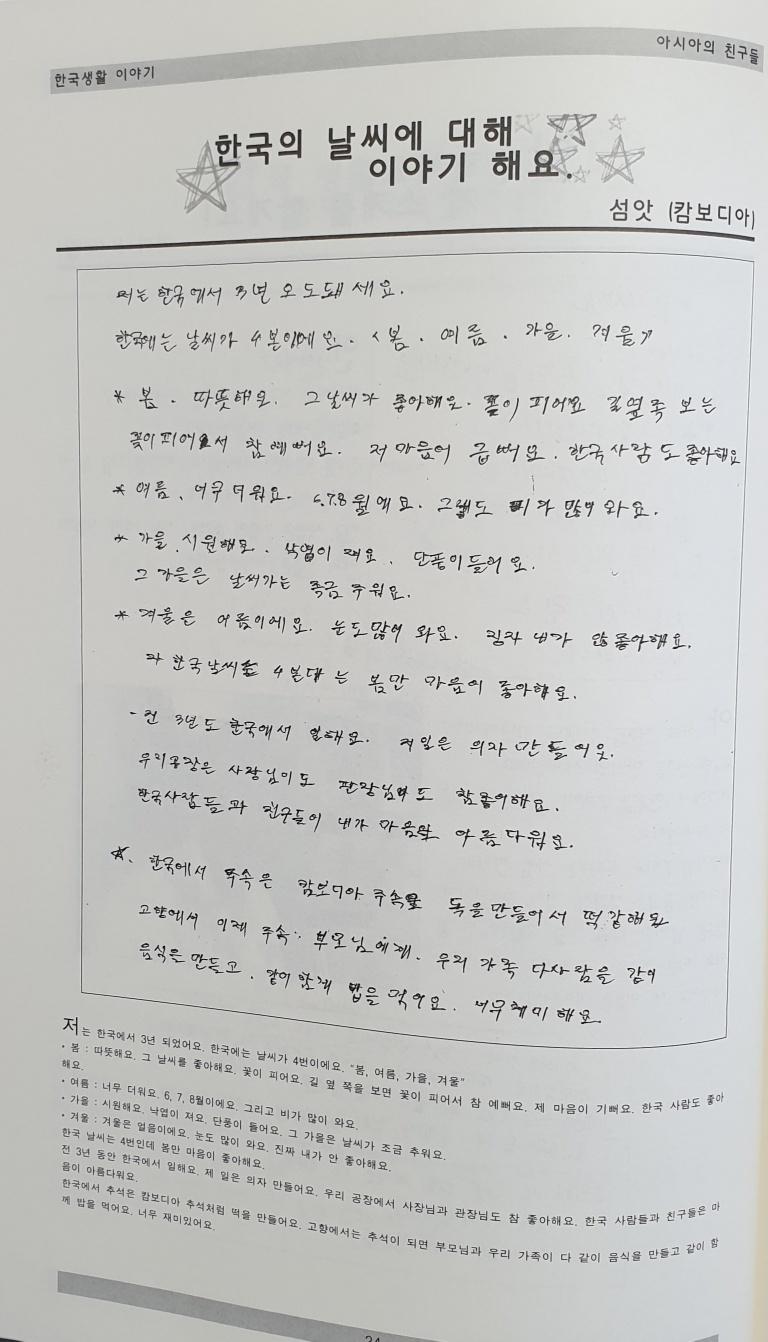한국의 사계절 소개와 추석의 캄보디아와의 공통점에 대한 글이다