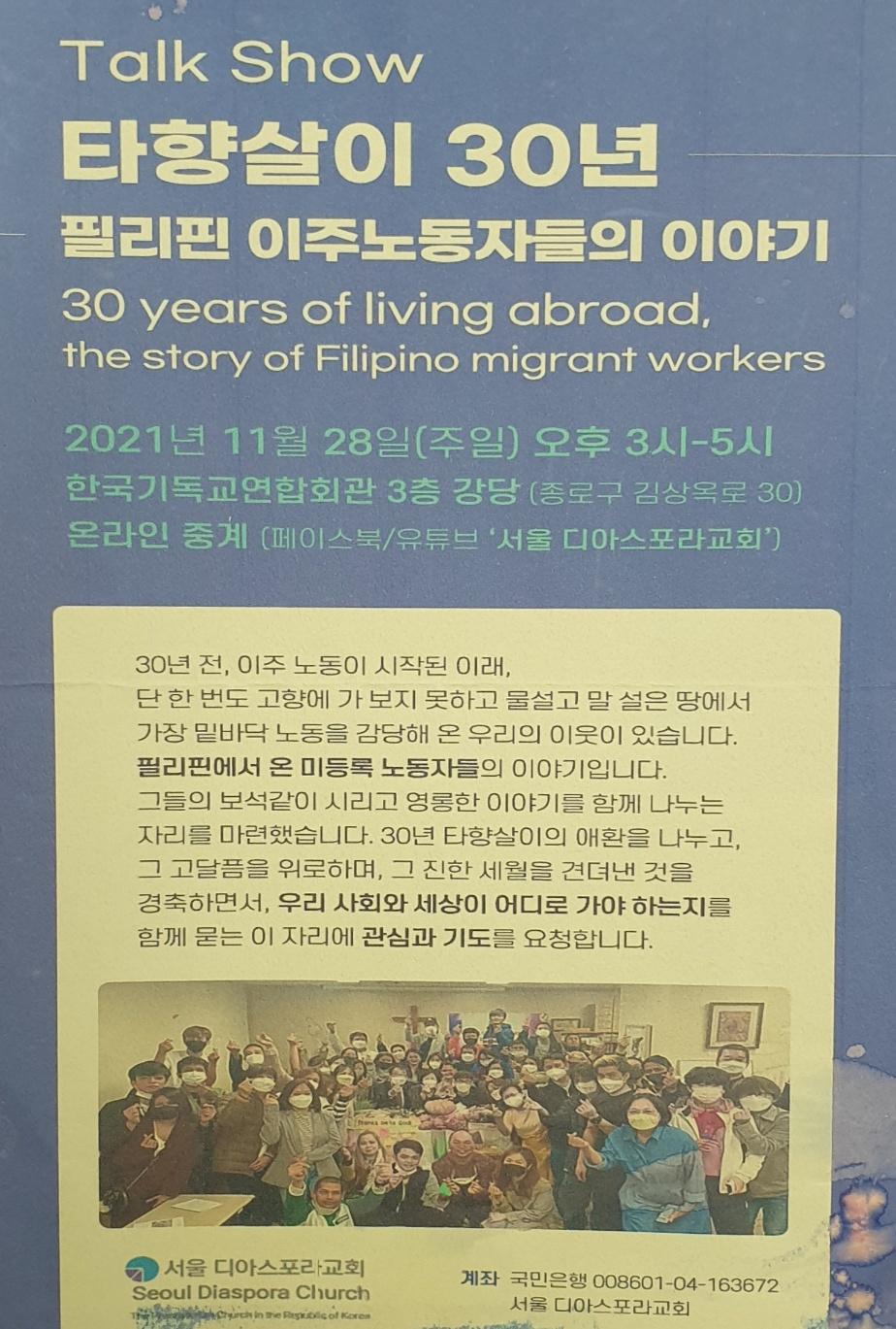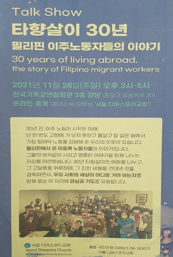 30년 동안 한 번도 고향에 가보지 못하고 우리사회 가장 밑바닥 노동을 감당해 온 필리핀에서 온 노동자들의 이야기를 듣는 행사 서울 디아스포라교회(정진우목사)에서 진행됨. 종이기록은 행사 당일날 배포됨.