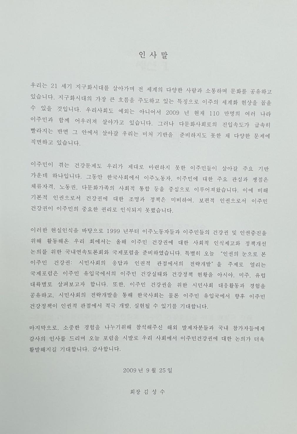 빠른 다문화사회로의 진입속도에 미치지 못하는 다양한 문제중 보편적 인권으로서의 이주민의 건강권에 대한 사회적 인식제고와 정책개선을 위한 국제포럼 보고서이다