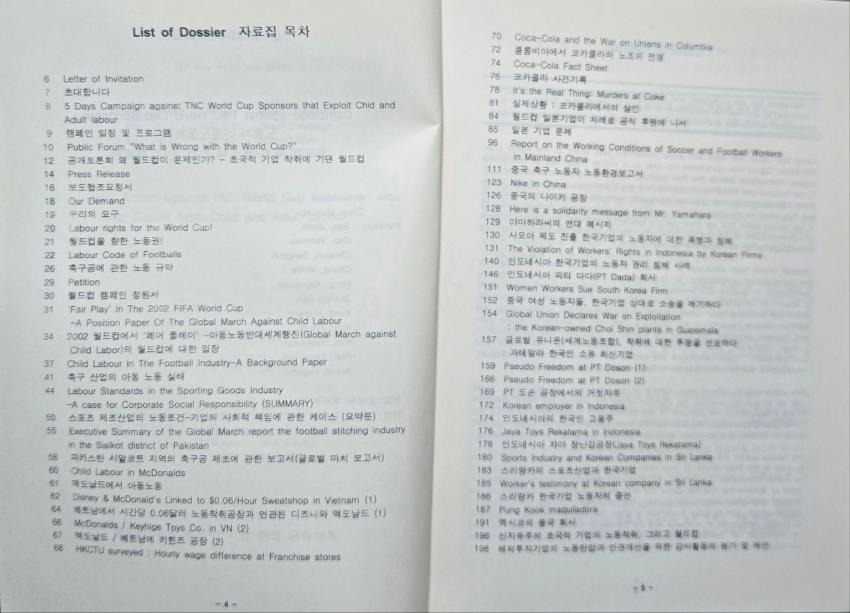 월드컵 후원 초국적 기업의 제3세계 노동자 착취를 폭로하고, 아시아 노동자들의 연대를 위한 "월드컵 캠페인" 참여를 위한 일정 및 자료집이다