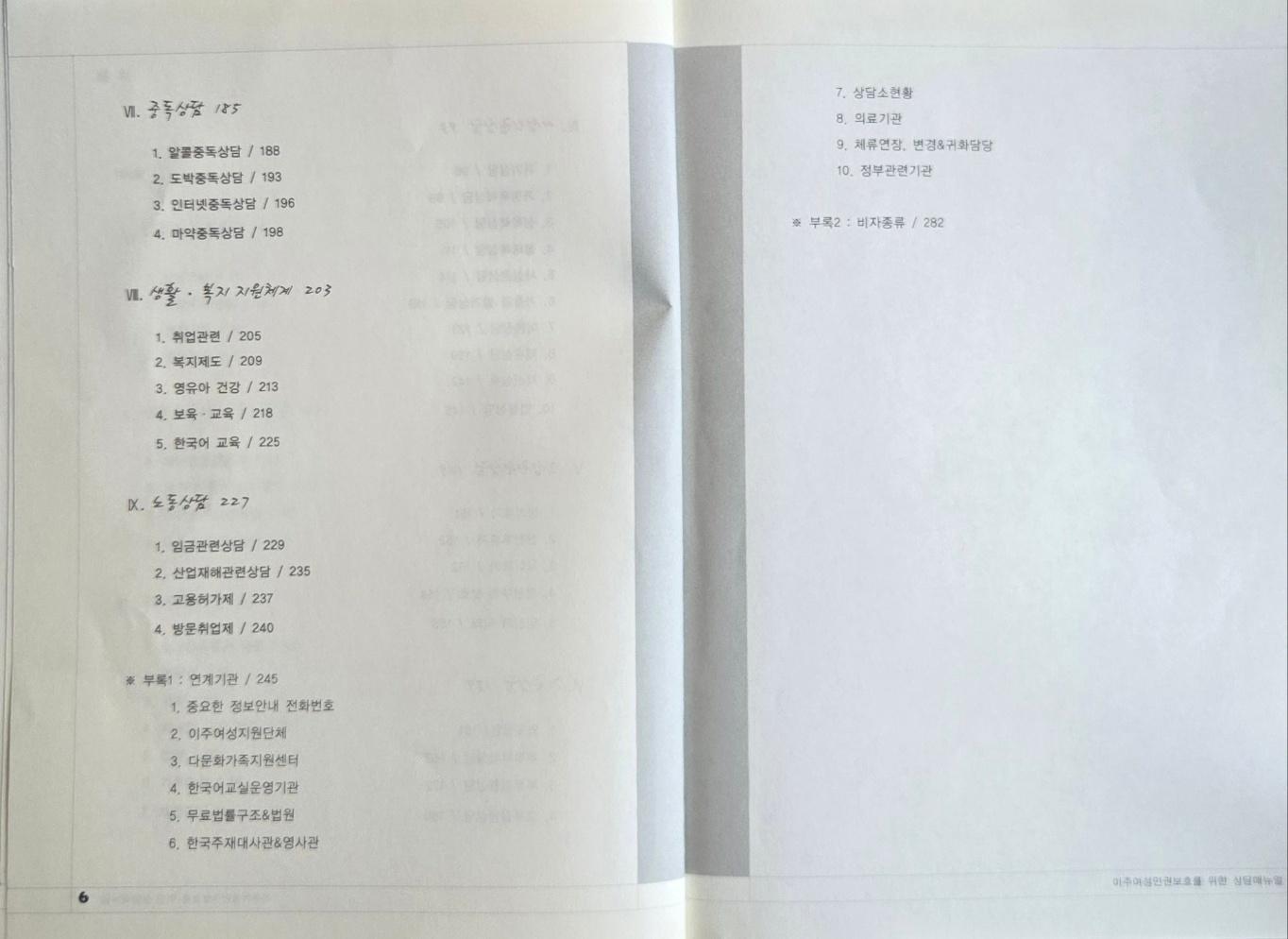 이주여성긴급지원센터 상담원이 상담을 할 때 확인할 사항과 필요한 사항을 정리한 매뉴얼이다