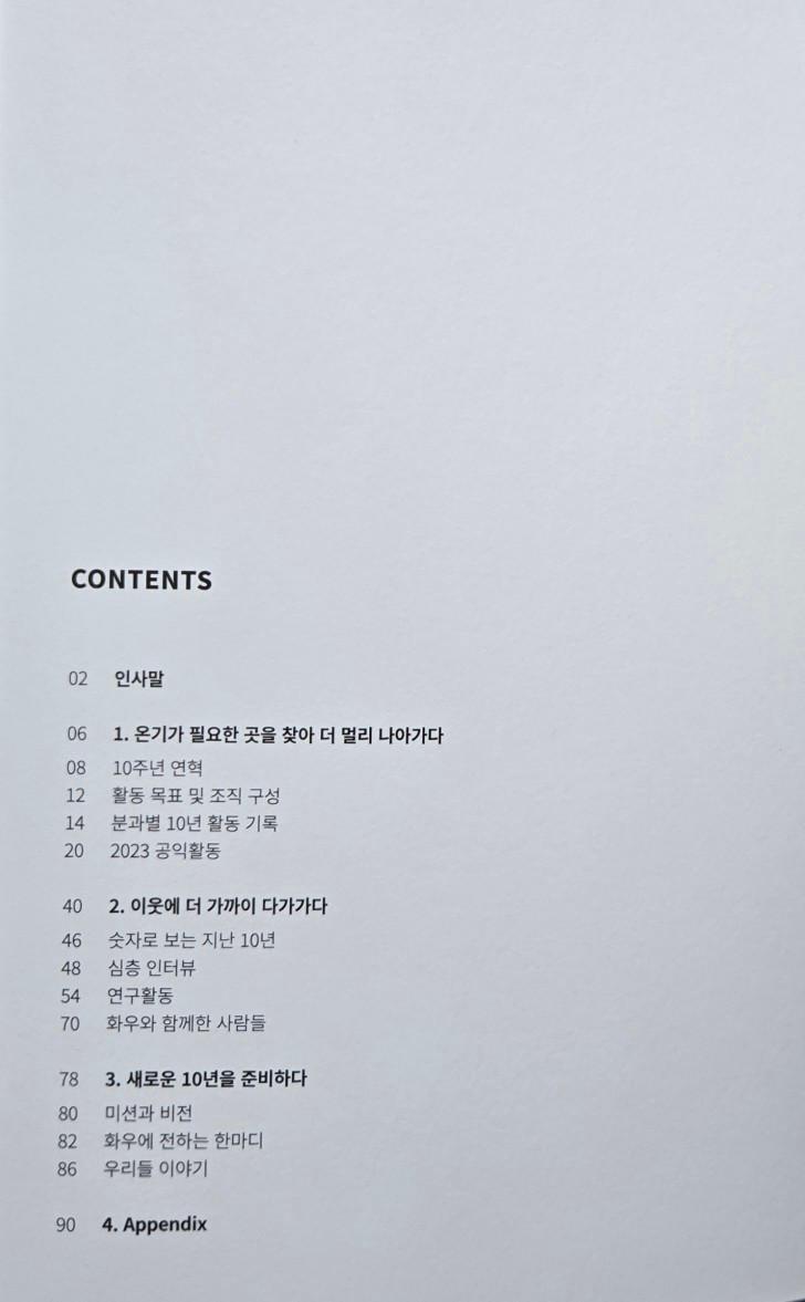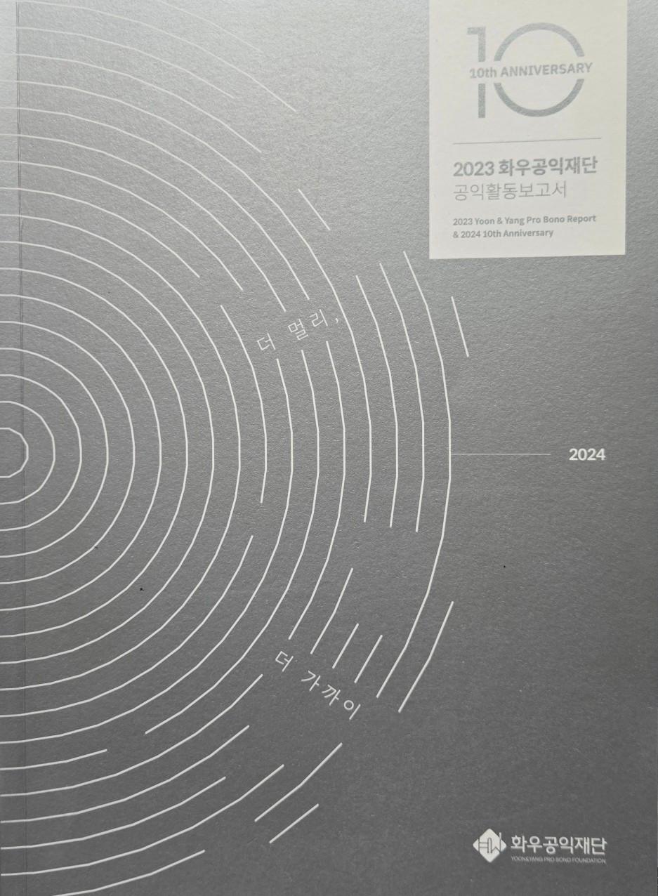 화우공익재단의 10년의 역사와 2023년 공익활동 소식을 담은 보고서이다
