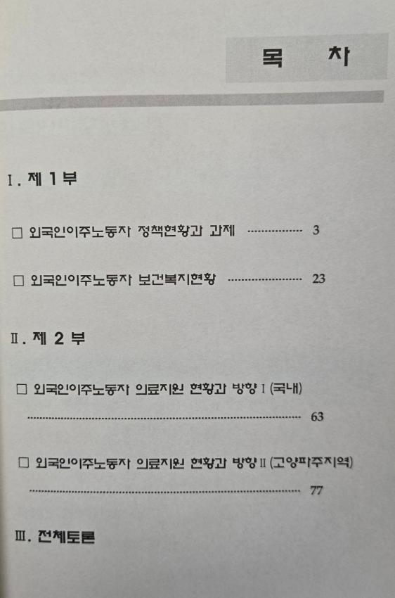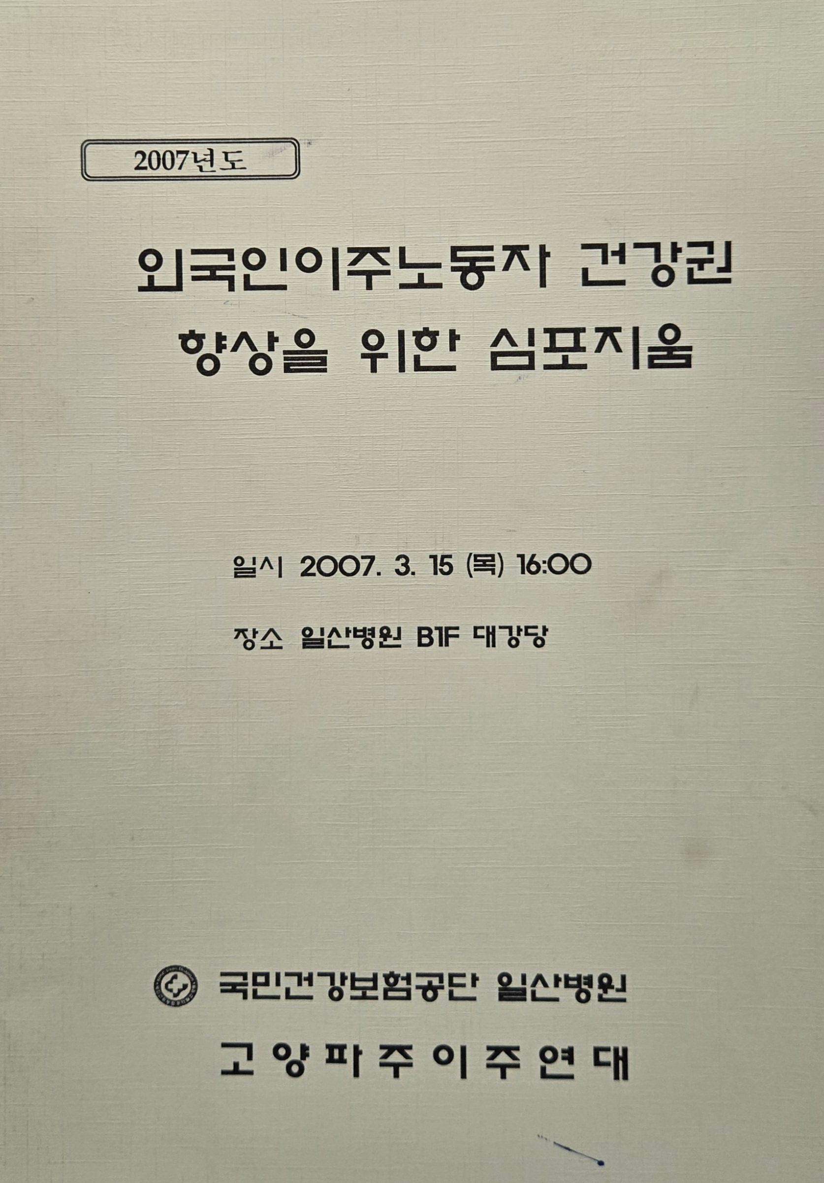 외국인 이주노동자에 대한 건강한 삶의 질을 향상 시킬 수 있는 관련 종보를 공유하고 이주노동자에 대한 체계적인 보건의료 안전망을 구축하기 위해 마련된 심포지움 자료집이다