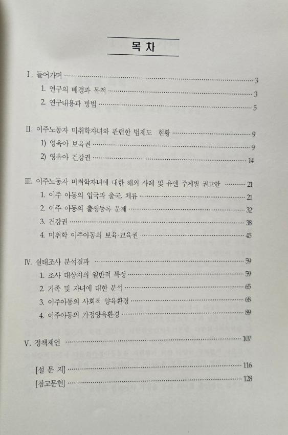 이주노동자의 미취학 자녀들이 발달에 필요한 자원들을 제공받고 유해한 환경으로부터 보호받으며 건강하게 자랄 수 있도록 하기 위한 적절한 지원방안을 찾기 위해 실시된 조사의 보고서이다
