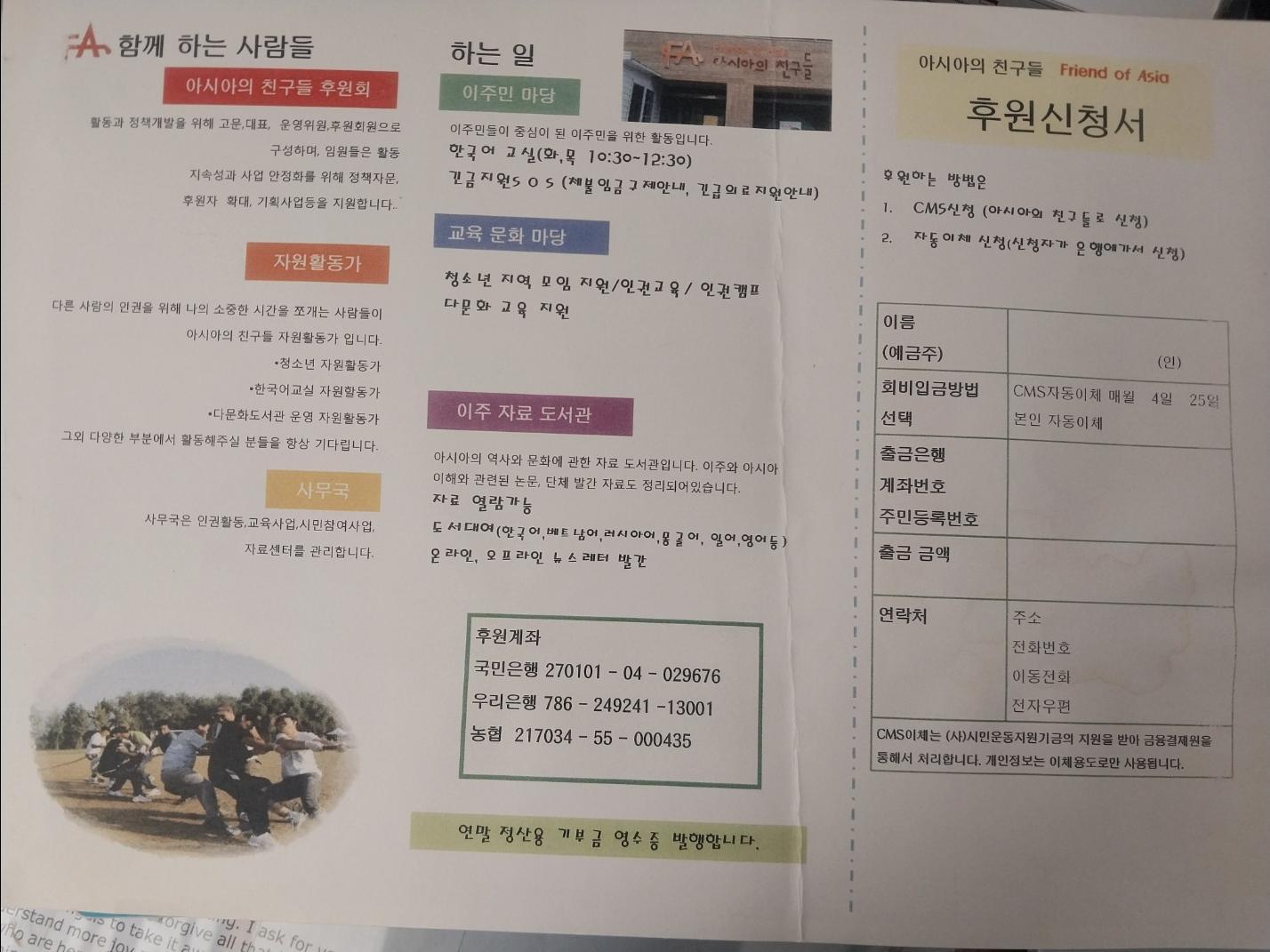 아시아의친구들 후원자 조직을 위해 제작한 브로셔이다. 활동 소명과 주 활동을 안내하였다.