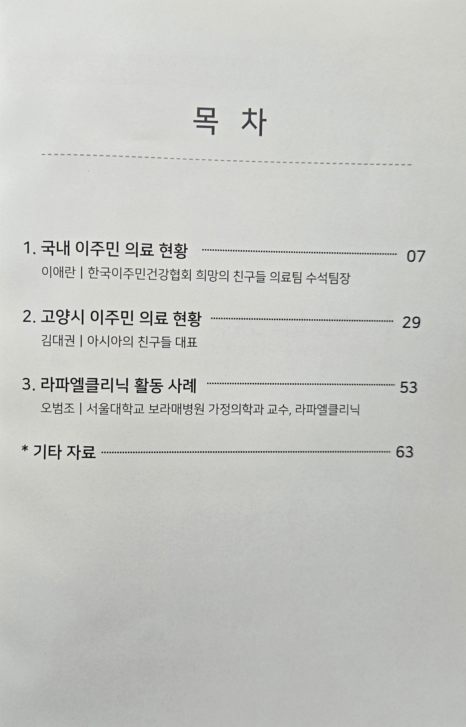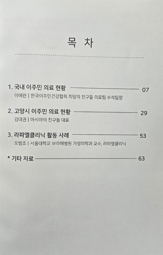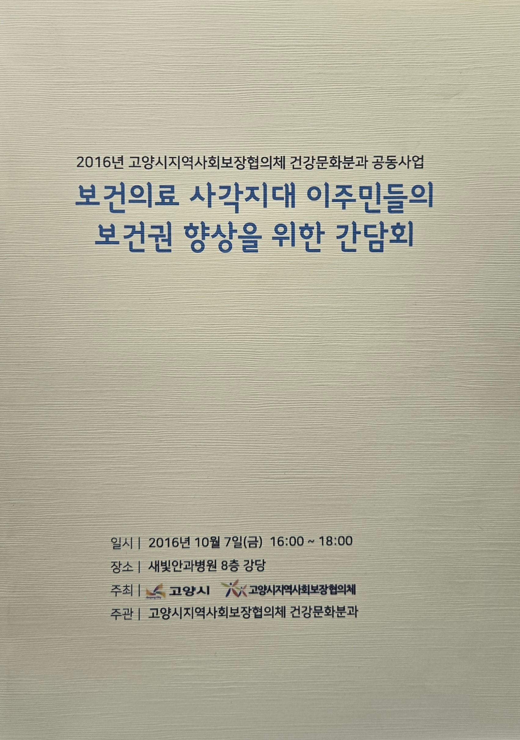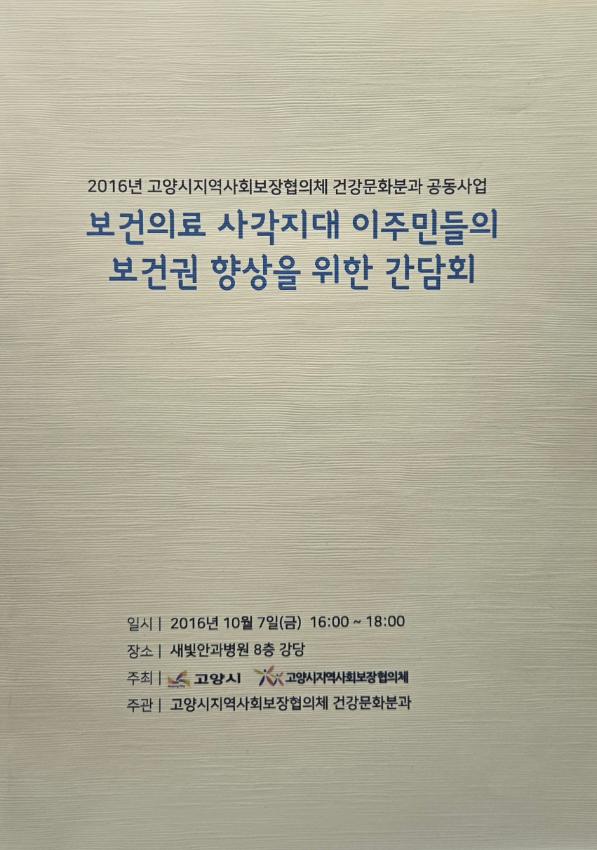 고양시지역사회보장협의체 건강문화분과 공동사업으로 보건의료 사각지대에 있는 이주민들의 보건권을 향상시키기 위한 방안을 모색하기 위해 연 간담회 자료집이다