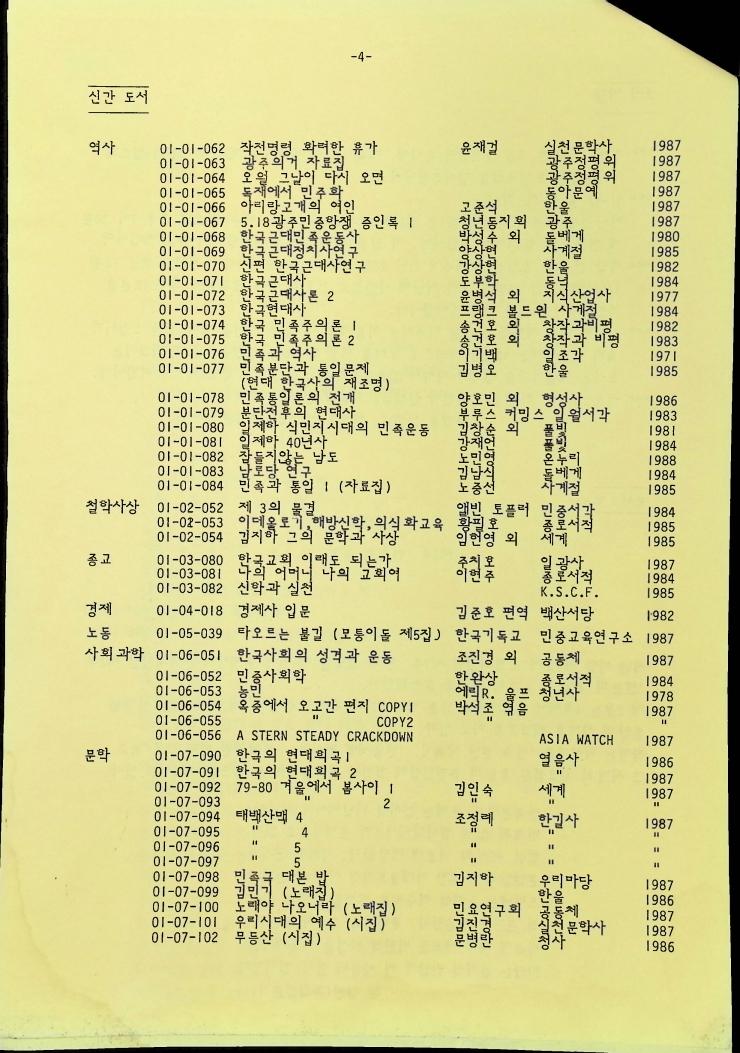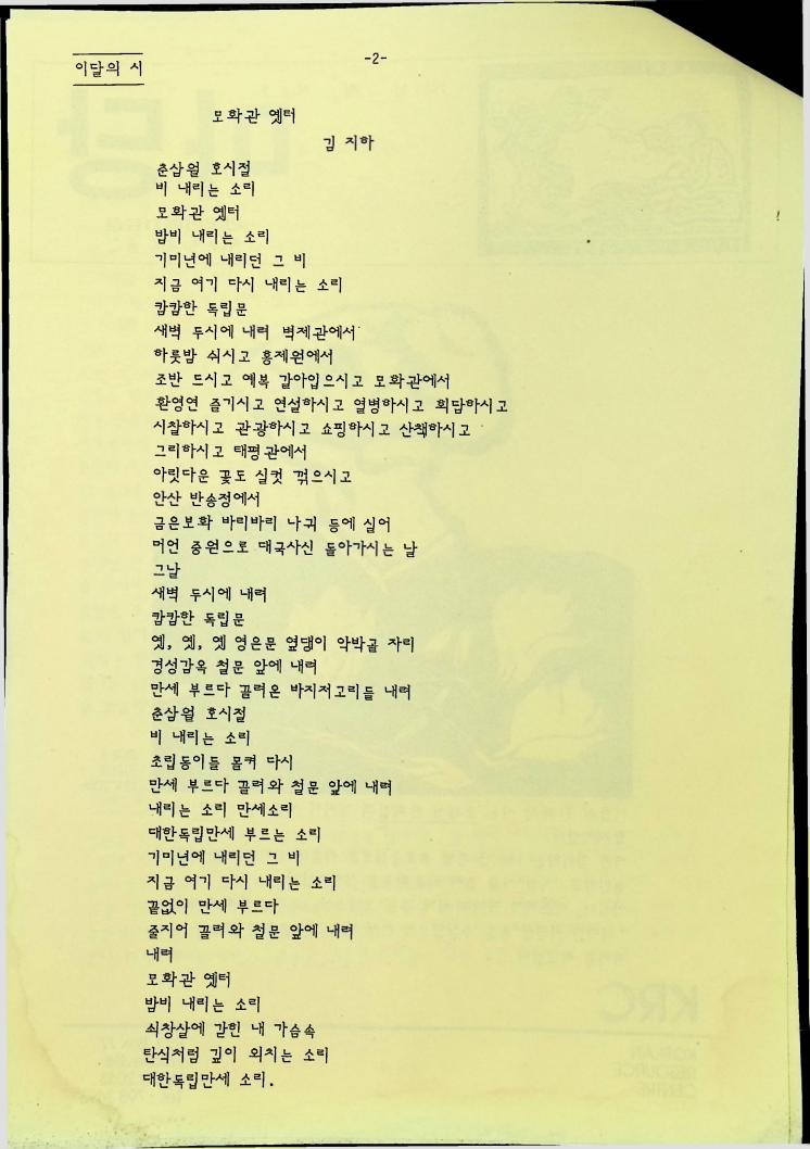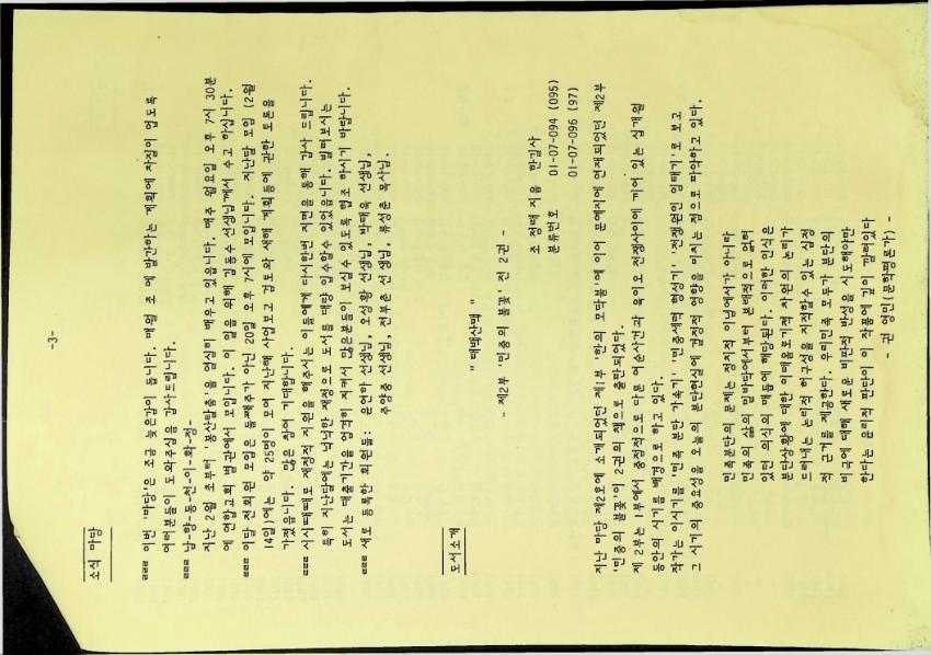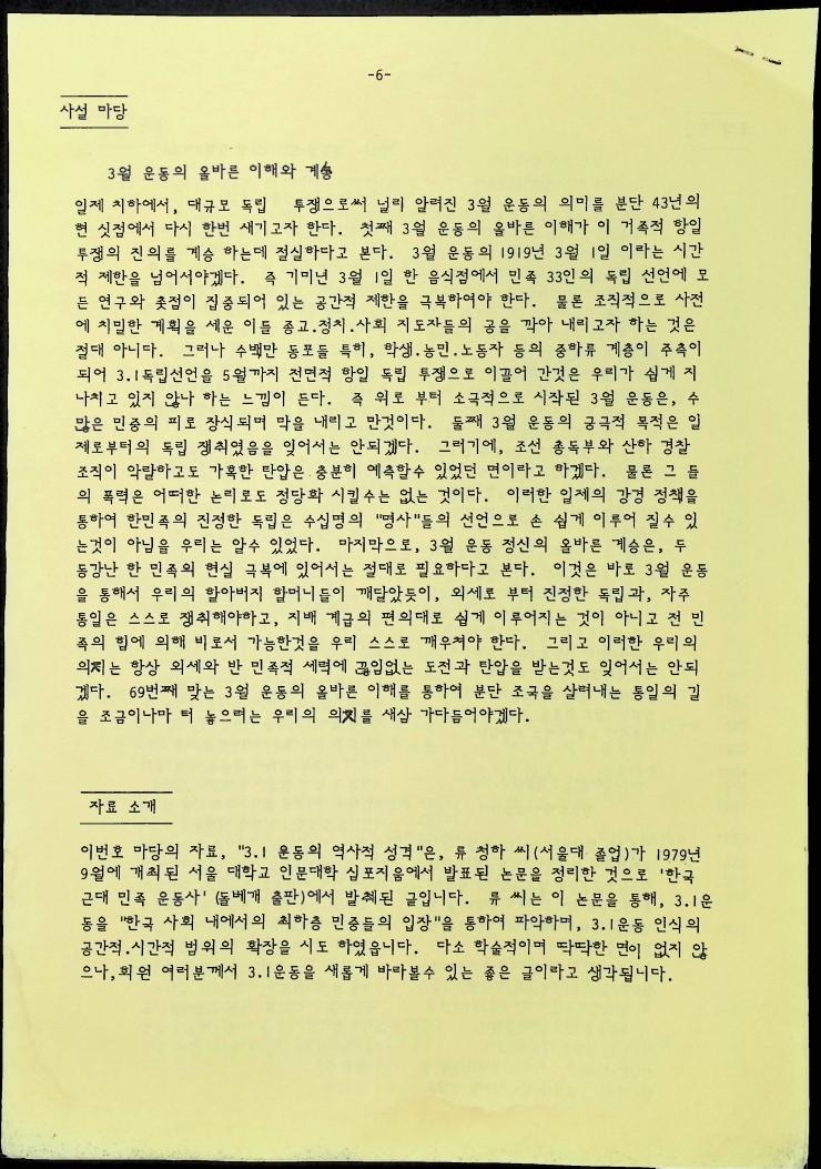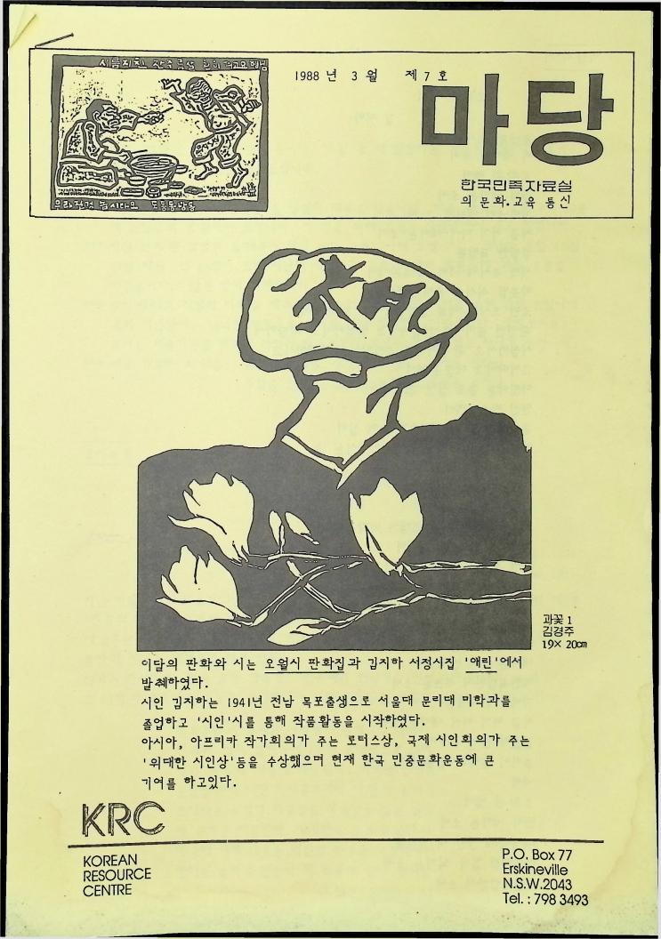 호주 한국민족자료실(Korea Resource Center)에서 만든 회원 소식지이다. 한국의 김지하 시, '테백산맥' 도서, 오월시 판화 등을 소개하였다. 이민청년학생들의 봉산탈춤 회원 모임 활동 소식 . 한국도서 신간 목록, 사회운동 관련 정세분석 등이 포함되어 있다. 회원모집 및 안내가 중요하게 소개되었다.