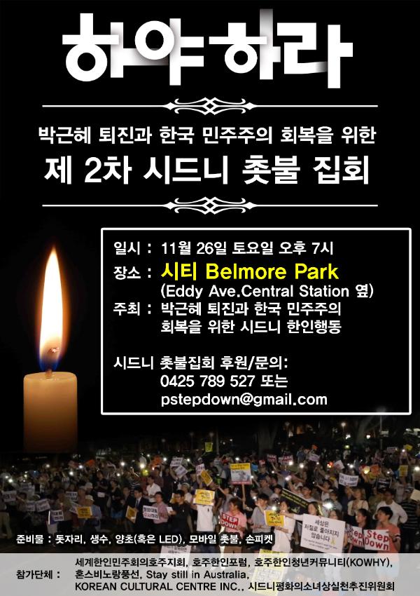 2016년 11월 26일 시티 Belmore Park에서 있었던 박근혜 퇴진과 민주주의 회복을 위한 2차 시드니 집회에 관한 자료와 이재명 성남시장의 영상, 관련 문구, 포스터 등이다