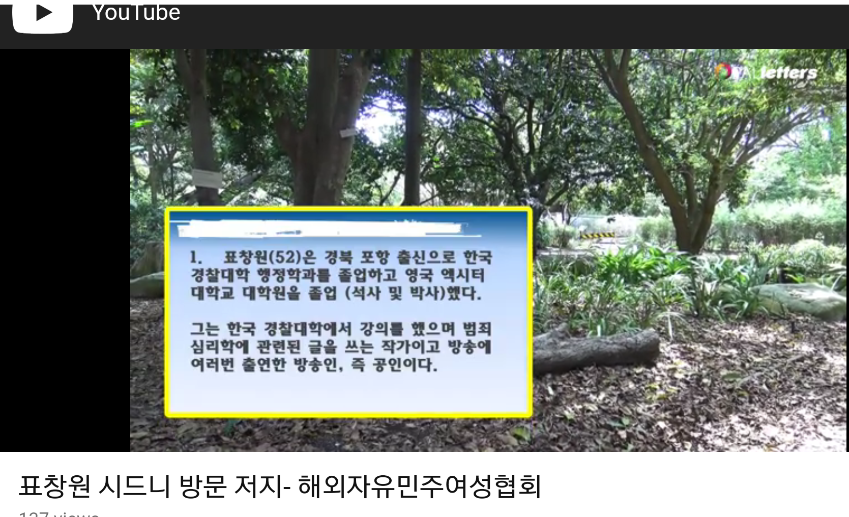 2019년 2월 2일 호주 스트라스필드에서 호주민주연합이 주최한 '호주동포와 꿈꾸는 대한민국 100년'이라는 행사에 북콘서트를 하는 표창원 더불어민주당 의원의 방문을 저지하기 위한 해외자유민주여성협회의 글이다