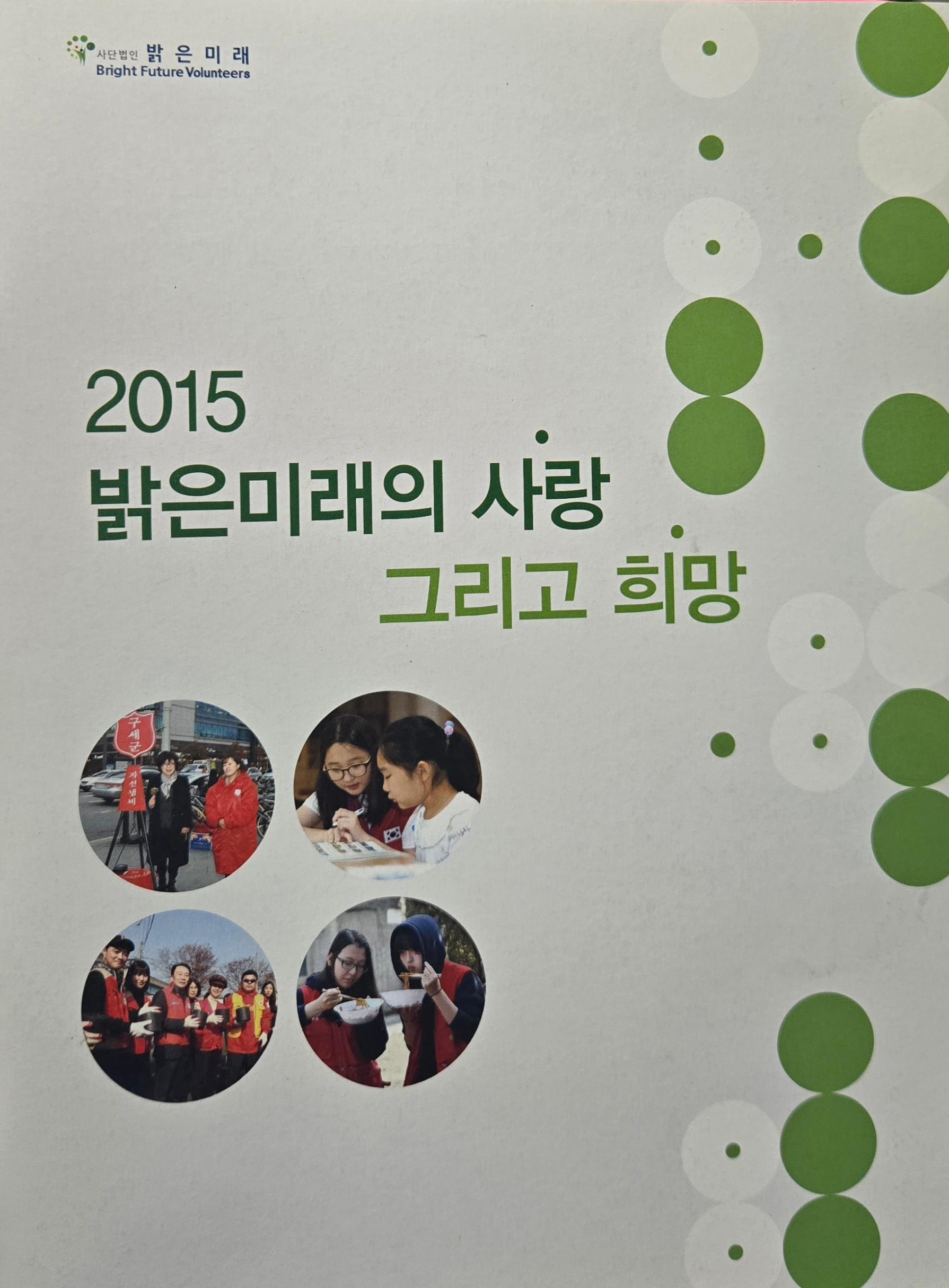 사단법인 밝은미래의 2015년 소식지로 청소년모니터봉사단 발대식 / 모니터봉사단 기사 작성 특강 / 재능 있는 소외계층 청소년을 위한 나눔 바자 / 네팔지진 피해 청소년을 위한 모금 행사 / 장애인의 날 짜장면, 문화나눔 봉사 / 충주 지부 다문화 행사 지원 등의 2015년 활동 내역과 총회등을 싣고 있다