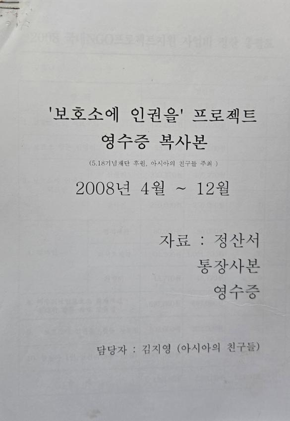 2008년 4월 부터 12월 까지 아시아의 친구들이 주최하고 5·18기념재단이 후원한 '보호소에 인권을' 프로젝트에 관련된 정산서, 통장사본, 영수증 등이다