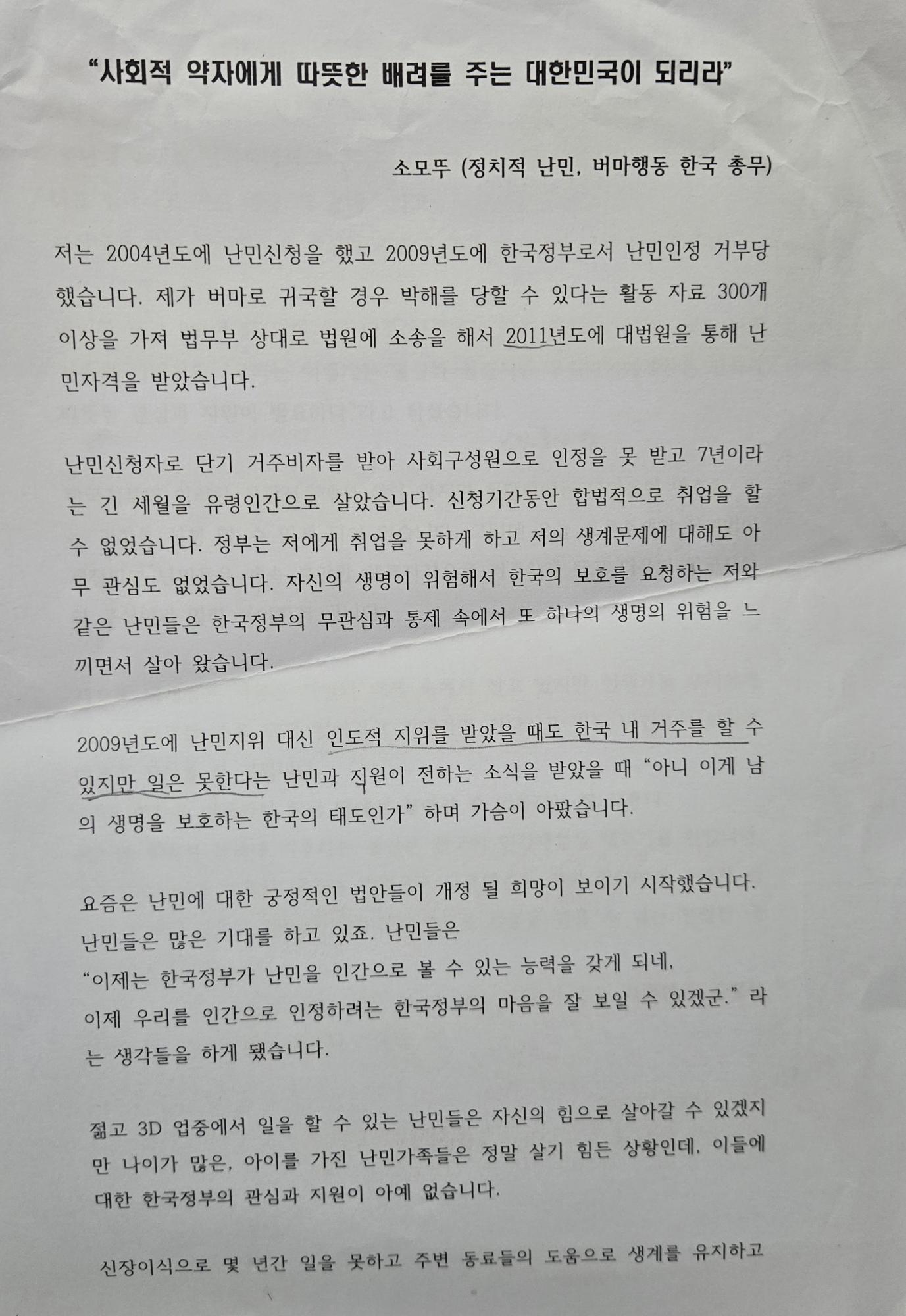 정치적 난민이자 버마행동 한국 총무인 소모뚜씨가 한국사회에서 사회적 약자인 난민에 대한 따뜻한 배려를 법적으로 보호해주는 것이 한국의 국가적 이익을 위해서도 도움이 될 것이라 호소하는 글이다