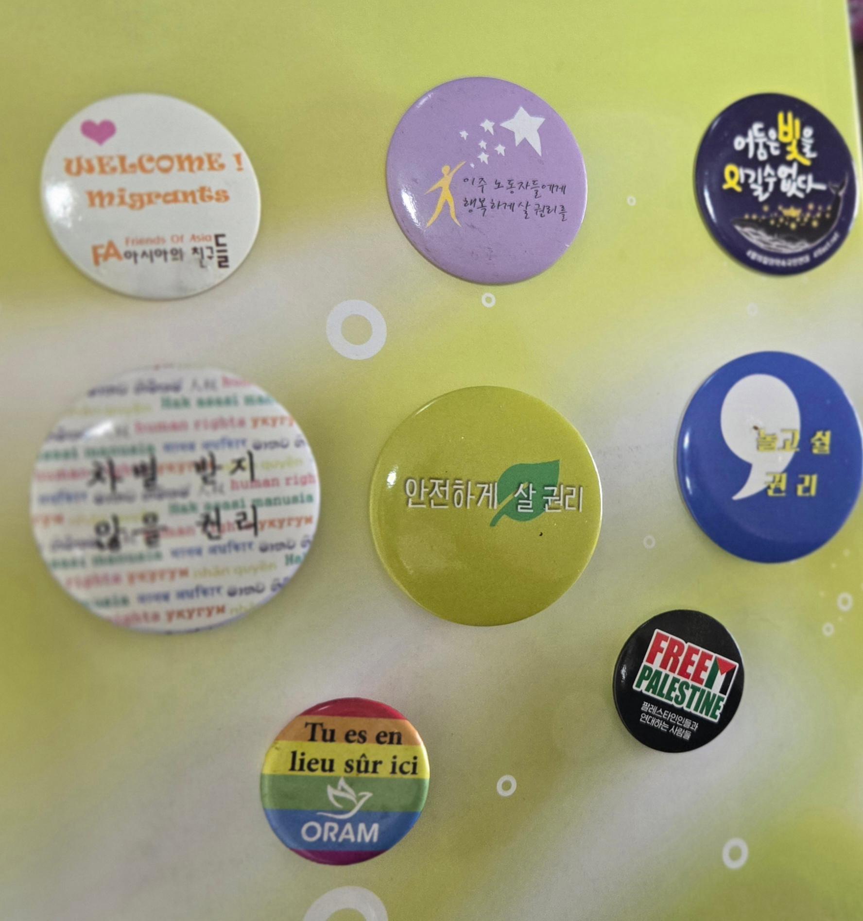 아사이의 친구들, 4월16일의약속국민연대, 팔레스타인사람들과 연대하는 사람들, ORAM, 놀고 쉴 권리, 안전하게 살 권리, 차별 받지 않을 권리, 이주노동자들에게 행복하게 살 권리를 등의 버튼 배지들이다
