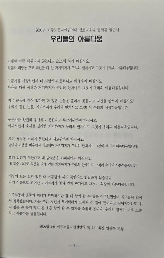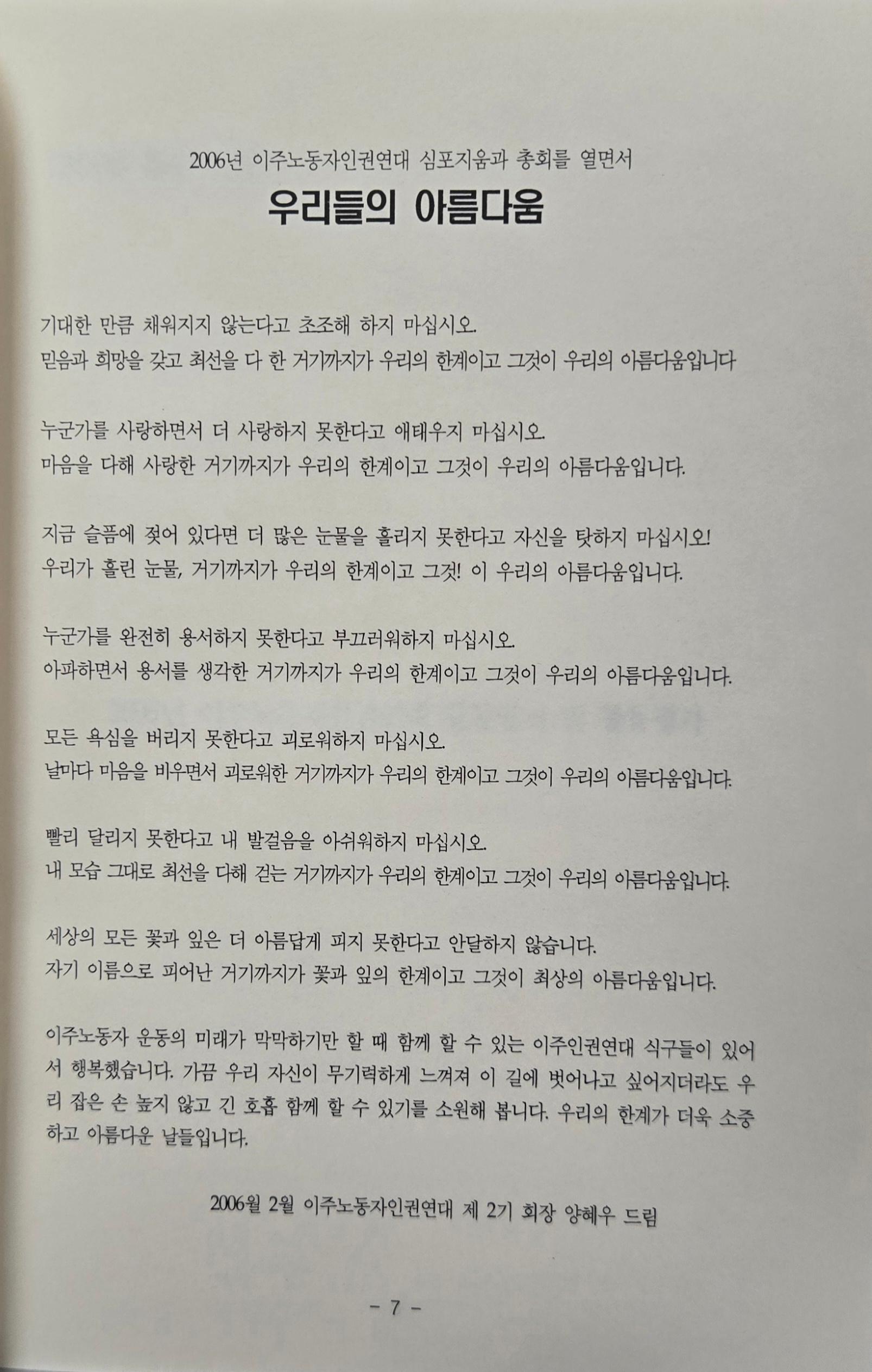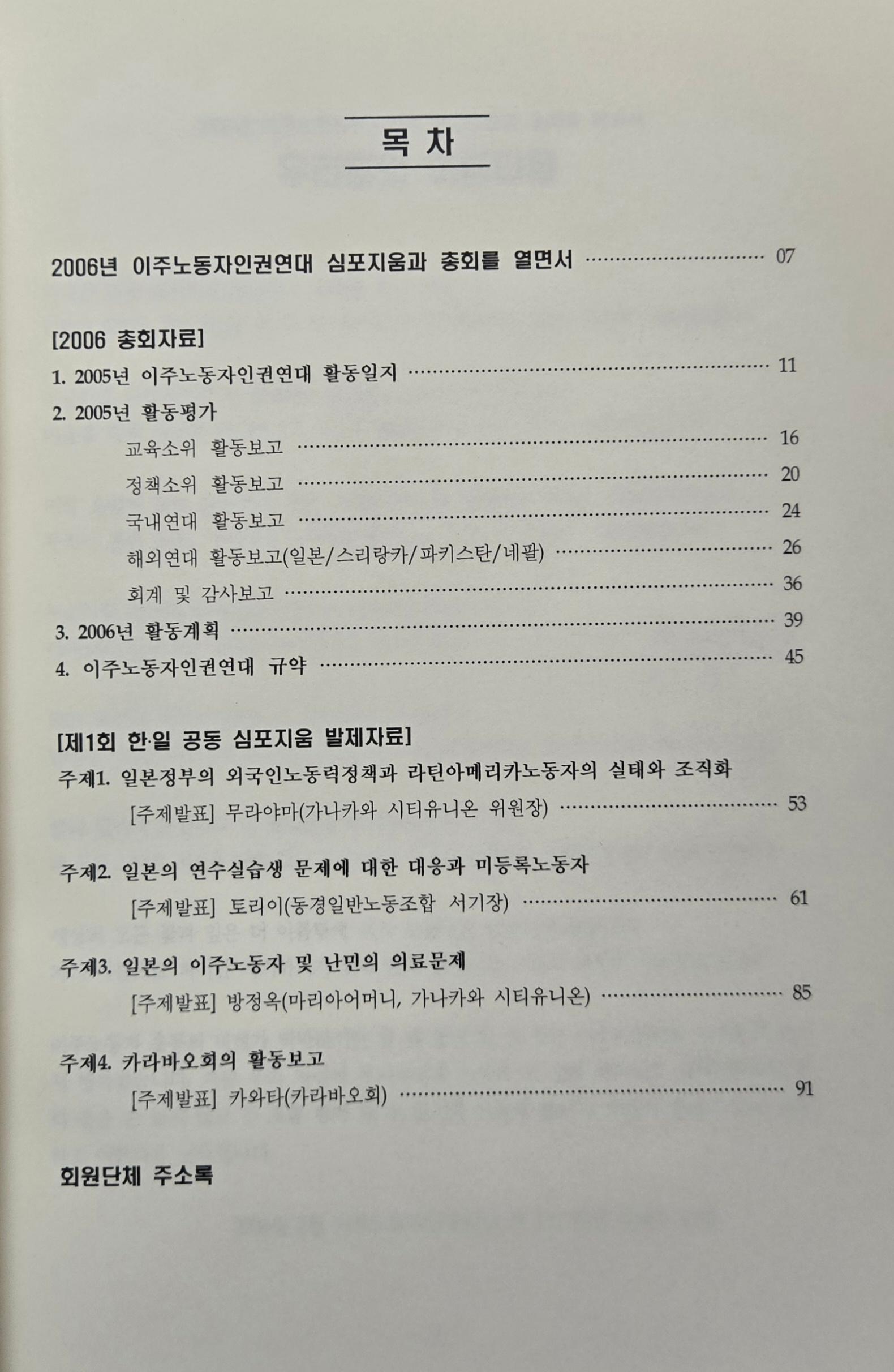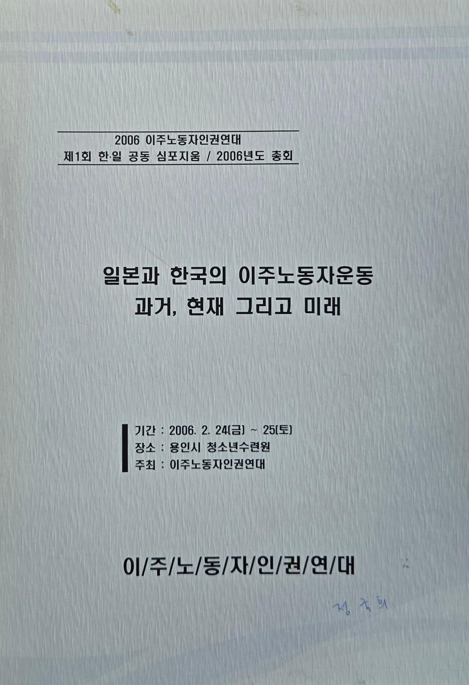 2006년 2월 24일부터 25일 까지 열린 2006 이주노동자인권연대의 제 1 회 한·일 공동 심포지움과 총회 자료집이다 일본정부의 외국인 노동력 정책과 라틴아메리카 노동자의 실태와 조직화 / 일본의 연수실습생 문제에 대한 대응과 미등록노동자 / 일본의 이주노동자 및 난민의 의료문제 / 카라바오회의 활동보고 등의 주제가 담겨 있다